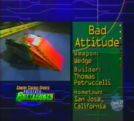 For Season 4.0, Bad Attitude featured a second wedge on its rear, mounted upside-down so it could lead with a wedge if flipped over. This negated a common negative to wedge designs where the static weapon would be rendered useless if the robot was overturned. The front wedge had a set of serrated teeth to hold robots on its wedge once in position. Bad Attitude did very well in competition, winning numerous fights, a Royal Rumble in Season 4.0 and being one of few robots to appear in all five televised seasons, almost always making the quarter-finals.