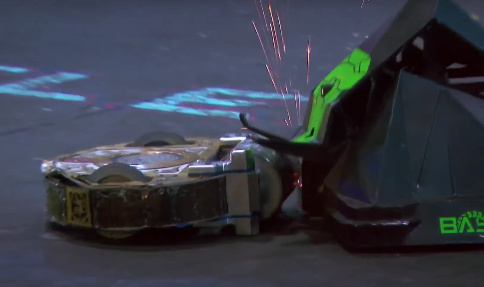 Basilisk with a disabled Afterbyte. Basilisk is hammered by Blacksmith. Blacksmith catches fire late on. The referee initiated a count-out, but in a race against the clock, Blacksmith showed late signs of life to interrupt the count and force a dramatic judges' decision. With Basilisk a non-factor for much of the fight, it lost the decision to Blacksmith, and thus was eliminated from the tournament. |