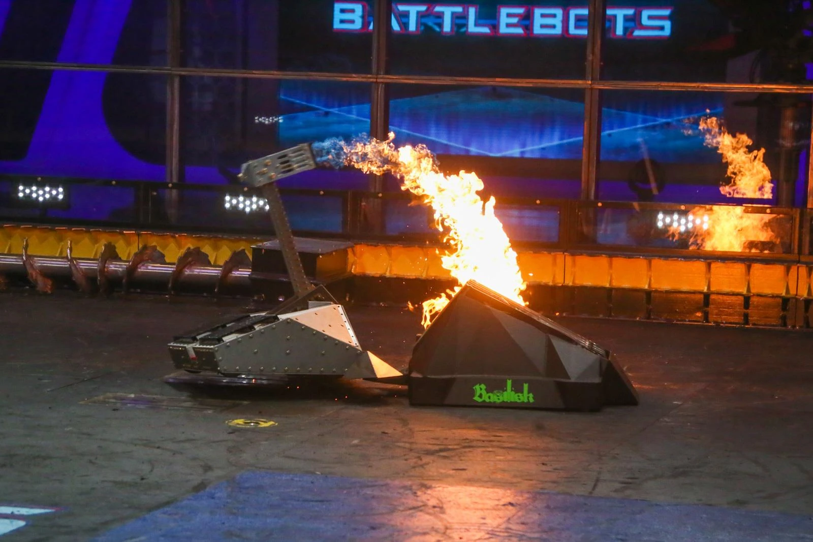 It was created by a brand new team of fabricators from Alberta, Canada led by Lucas Sloan. Basilisk's weapon was an aluminum flipping arm which could supposedly "strike three times faster than the blink of an eye" due to eight custom-manufactured twitch valves. The flipper ran at 3000psi, but struggled to be an effective weapon during fights.