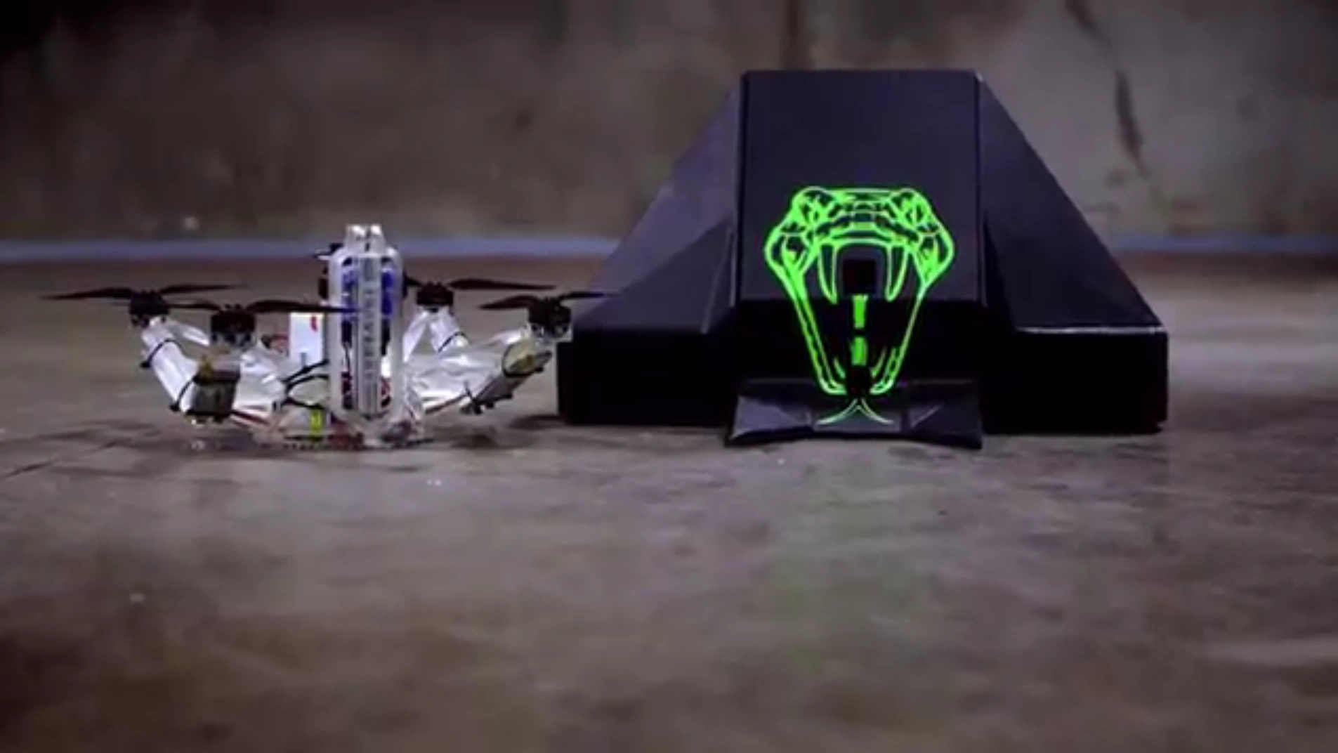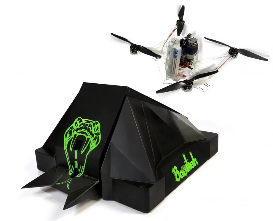 The robot was armored in steel, sporting a total of twelve small wheels (four sets of three in parallel) which were powered by four motors. In addition to its flipper, the robot was armed with a pneumatic spear that fired through the lower hole in the robot's flipping arm. Basilisk was also joined in the arena by Afterbyte, a 10lb flying drone equipped with a unique weapon - AfterByte could theoretically latch itself onto the top of another robot using vacuums and 3D-printed skirts, then use its drill weapon to penetrate the top armor. The team claimed AfterByte had in excess of 100lb of holding force on a flat surface, though it rarely had a chance to prove this in the BattleBox. It lost its only fight of World Championship II, which was a three-way qualifying rumble against Gemini and Blacksmith.