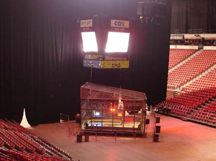 Very little information on the Cisco Party event is publicly available, other than for spectator numbers (around 3,000 according to Jim Smentowski, out of a total of 8,000 conference visitors) and the 'scaled-down' version of the BattleBox which was created specially for it. This differed from other versions of the arena in having a rectangular base (16ft x 24ft) and only two pulverizers located in the arena corners, as well as a prominent 'interior wall' section which reportedly made it more difficult for certain robots to maneuver around.[1]
