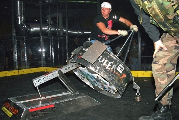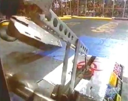 BioHazard also competed in US Robot Wars events and won the heavyweight title twice, both in 1996 and 1997. These accomplishments made it one of the the most successful bots in the history of combat robotics. Originally, it had two forklift-like plates on its lifting arm and no anti-wedge skirts, but it had a spring-loaded anti-intrusion device underneath its frame which prevented wedges from getting underneath. The anti-wedge skirts were added in 1997 for more protection against flipping.