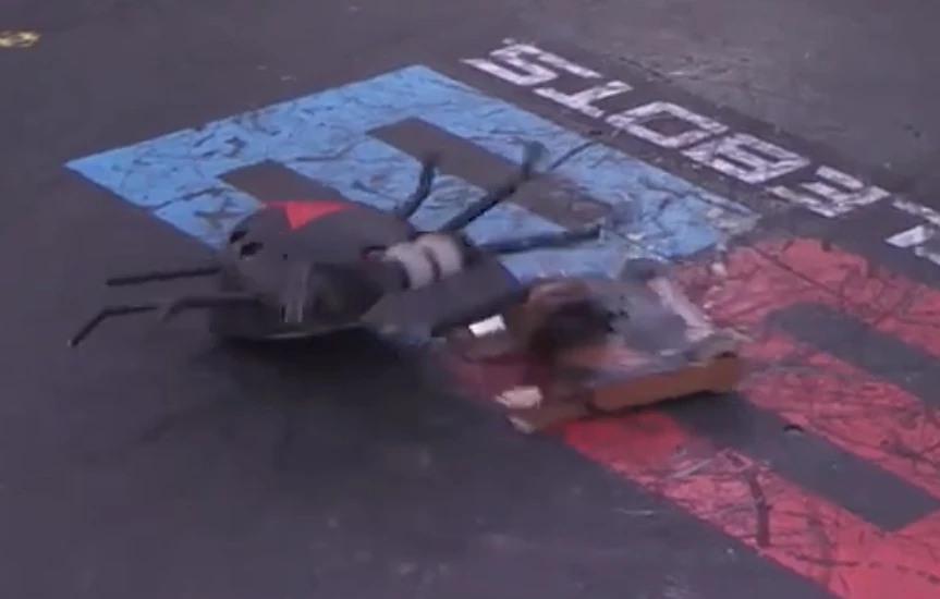 Built by the New York based Henzel family, Black Widow was a large, dome shaped robot designed to resemble the spider of the same name. For weaponry, it was armed with a spinning drum on the front of a wedge, as well as a flamethrower coming from its rear legs. It had a red hourglass painted on the top, and eight legs made from pipes sticking out of the sides, acting as spider legs. These legs were not intended for walking, but according to Diana Tarlson, Black Widow's legs were connected to a mechanism which moved them independently to imitate walking as the drive wheels moved.[1] The robot was also able to emit silly string from its rear, further showcasing its arachnid theme.