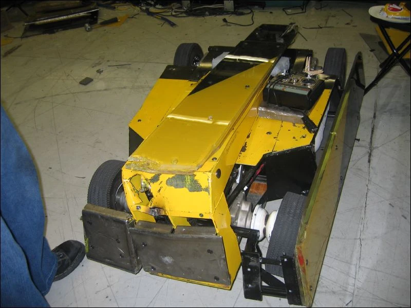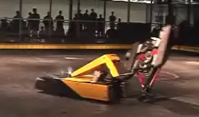 Bounty Hunter was counted out, giving The Judge the win by KO. Bounty Hunter was now put in the loser's bracket where it faced OUCH!!. When the match began, Bounty Hunter tried to box rush OUCH!! to prevent it from getting up to speed, but OUCH simply moved to the side to avoid it, so Bounty Hunter backed up and charged into OUCH!!, and the two made contact. The impact ripped off the tip of its flipper along with its left front armor plate. With OUCH!! already back up to speed, Bounty Hunter moved in to take a second blow, which tore the right front armor plate off along with the entire right side panel. That second blow immobilized Bounty Hunter, and it was counted out, giving OUCH!! the win by KO and eliminating Bounty Hunter from the tournament.