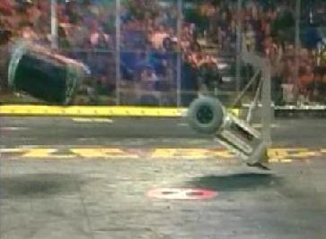 Bumper Bawt vs. Kegger Kegger axes the flipped BumperBawt. Bumper Bawt's only match of the season was against Kegger. This fight was over in about 10 seconds. The robots moved towards each other, Bumper Bawt reaching the middle of the arena as Kegger lined up a shot, but Bumper Bawt drove directly over the arena hell-raisers, which popped up suddenly and flipped it over. Kegger then took the opportunity to hammer Bumper Bawt a few times as it was counted out. Kegger won by KO at 1:06 and Bumper Bawt was eliminated from the tournament. |