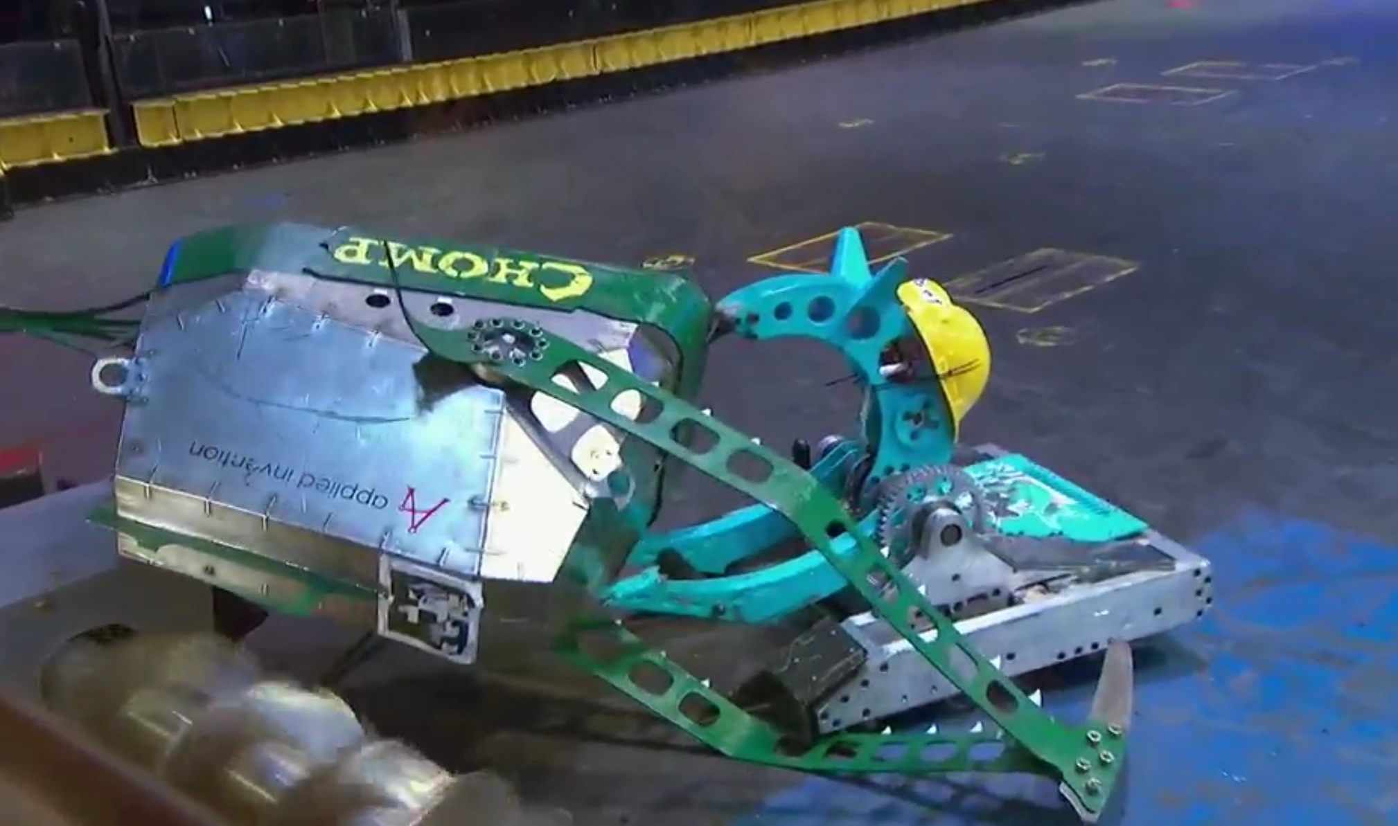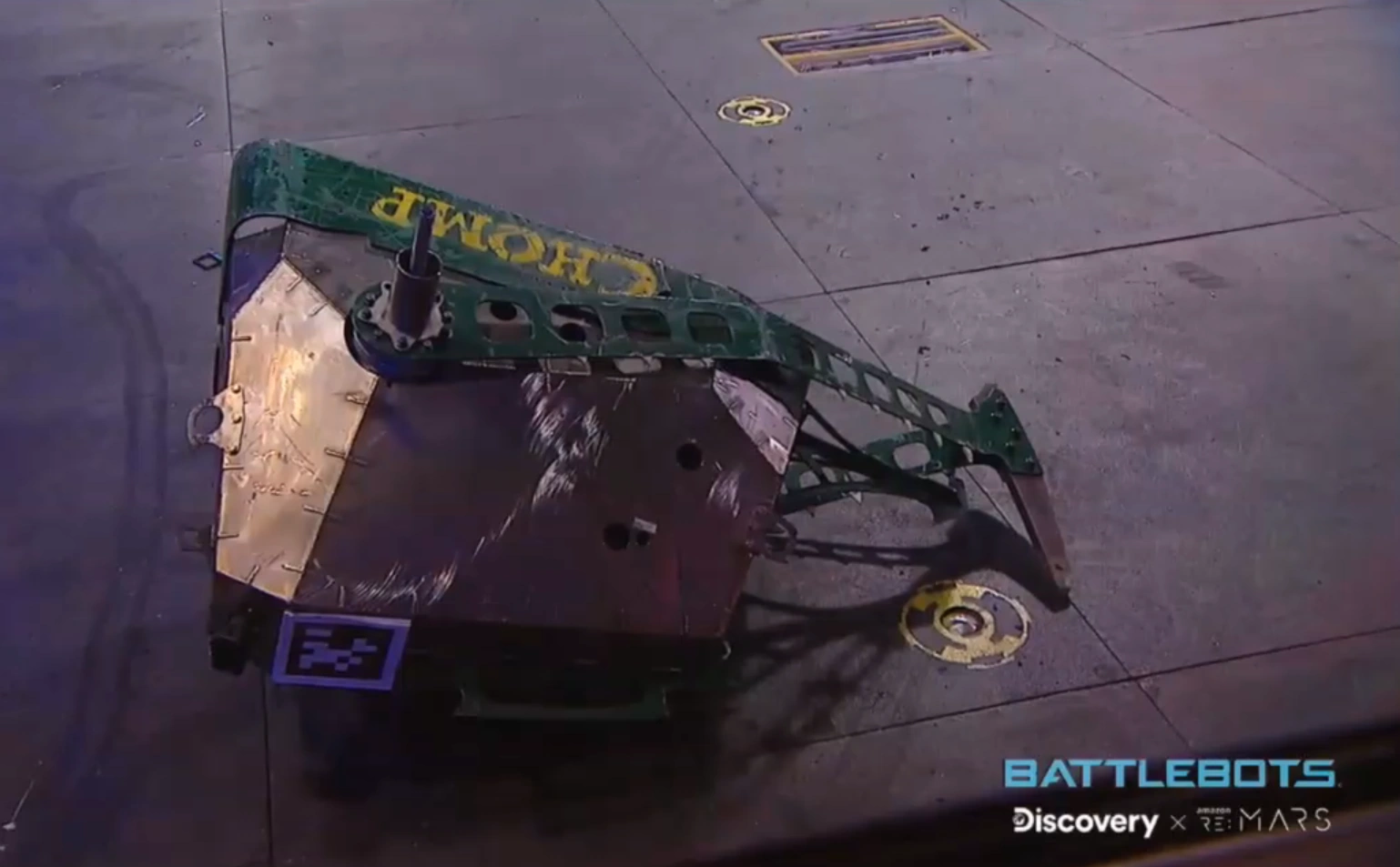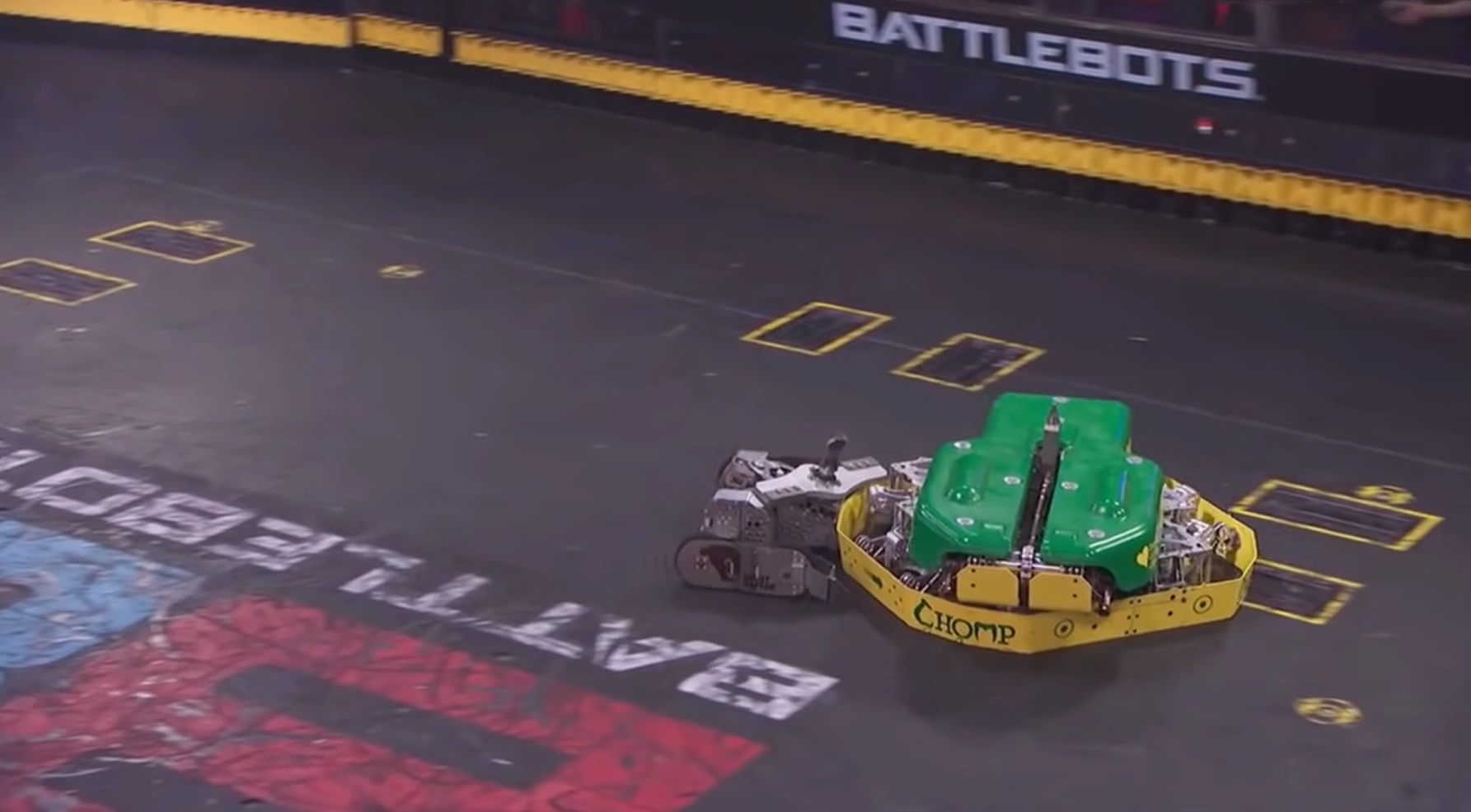 Chomp lays on its side as its hammer arms are left mangled. Regardless, Chomp kept pushing and firing flames at HUGE as the match entered its second half. During another exchange in the BattleBox center, it sustained more damage to the hammer, in an attack where HUGE momentarily flicked it onto its right-hand side. Chomp kept pressuring HUGE, feeding flames and ramming it with the now severely mangled hammer. The hammer arms, however, were twisted further out of alignment by HUGE, which momentarily retreated following collisions with the rising Killsaws. Chomp circled around and lured HUGE once again across the center, tanking another hit from HUGE when both competitors next met. This turned Chomp onto its left-hand side, where it rested for a few seconds before using one of its pistons to self-right. Chomp grazed the Killsaws as it made a backwards turn, and weathered more blows to its front armor from HUGE. These bent the hammer arms further inwards, high-centering the Machine Corps entry until it was able to lever itself back onto its wheels. Chomp performed another press-up in between excursions to the lower-right Killsaws, after which it charged towards the partially-immobile Surrenderbot! While turning right, it toppled over, balancing on its left stabilizer and giving HUGE a chance to flick it back upright. Chomp finished by pushing HUGE into the lower-right corner by its left wheel; both robots survived to a Judges' decision, which unanimously ruled against it. While commending its resilience, flame attacks and use of the BattleBox hazards, Chris Rose inferred that the damage to its hammer was a significant factor in its loss.