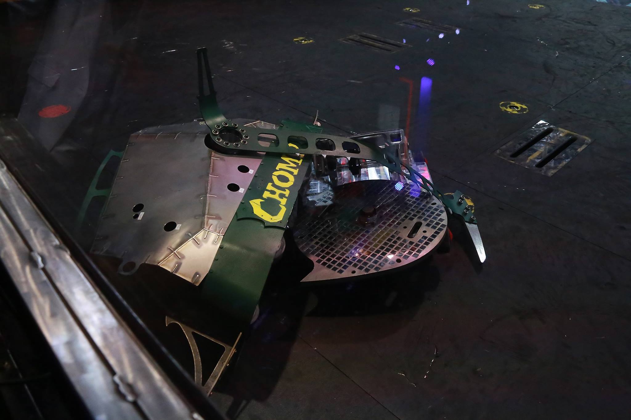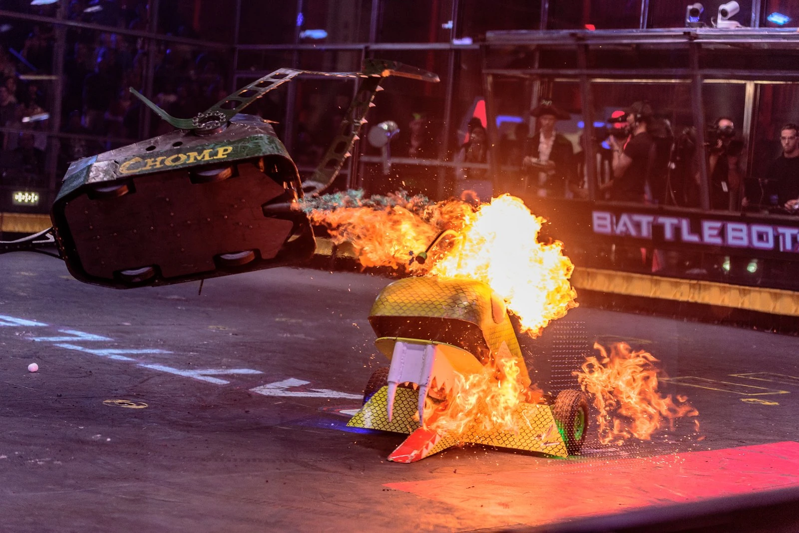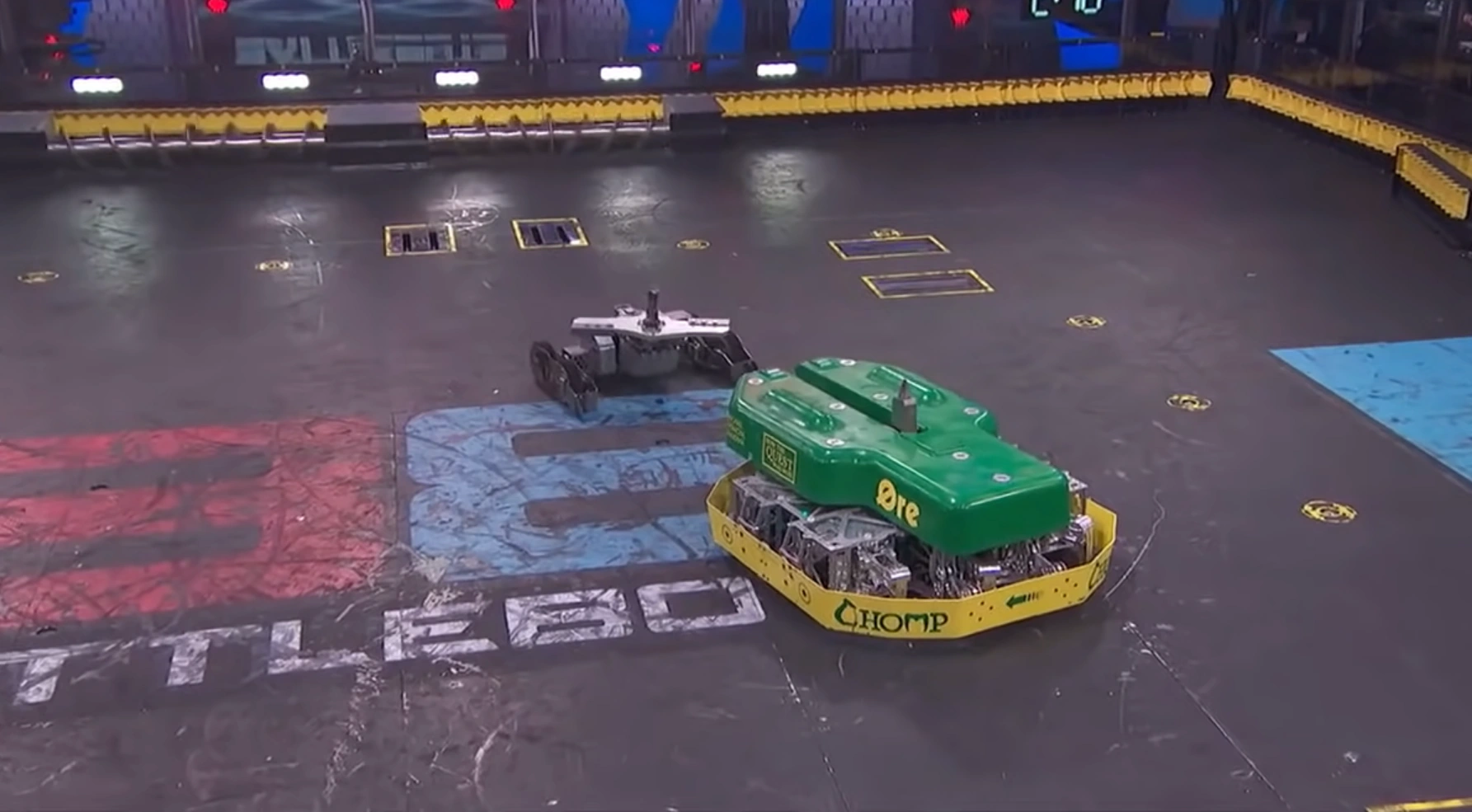 Chomp lays on its side as its hammer arms are left mangled. Regardless, Chomp kept pushing and firing flames at HUGE as the match entered its second half. During another exchange in the BattleBox center, it sustained more damage to the hammer, in an attack where HUGE momentarily flicked it onto its right-hand side. Chomp kept pressuring HUGE, feeding flames and ramming it with the now severely mangled hammer. The hammer arms, however, were twisted further out of alignment by HUGE, which momentarily retreated following collisions with the rising Killsaws. Chomp circled around and lured HUGE once again across the center, tanking another hit from HUGE when both competitors next met. This turned Chomp onto its left-hand side, where it rested for a few seconds before using one of its pistons to self-right. Chomp grazed the Killsaws as it made a backwards turn, and weathered more blows to its front armor from HUGE. These bent the hammer arms further inwards, high-centering the Machine Corps entry until it was able to lever itself back onto its wheels. Chomp performed another press-up in between excursions to the lower-right Killsaws, after which it charged towards the partially-immobile Surrenderbot! While turning right, it toppled over, balancing on its left stabilizer and giving HUGE a chance to flick it back upright. Chomp finished by pushing HUGE into the lower-right corner by its left wheel; both robots survived to a Judges' decision, which unanimously ruled against it. While commending its resilience, flame attacks and use of the BattleBox hazards, Chris Rose inferred that the damage to its hammer was a significant factor in its loss.