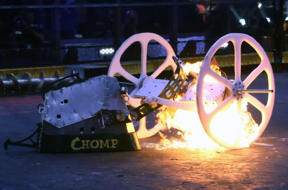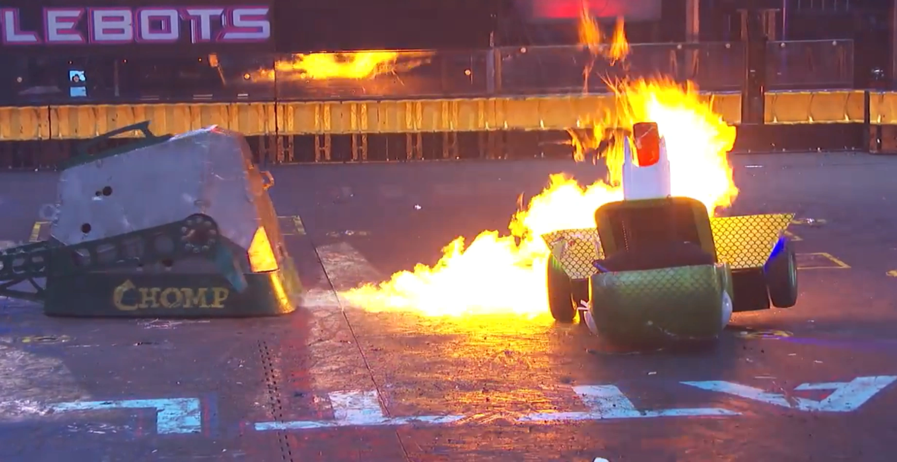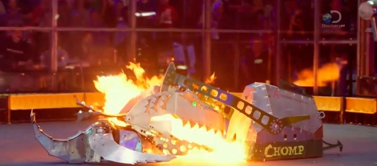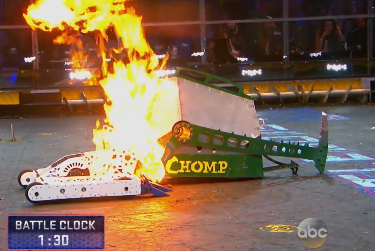 Chomp vs. Bale Spear Chomp's fuel tank fire. |