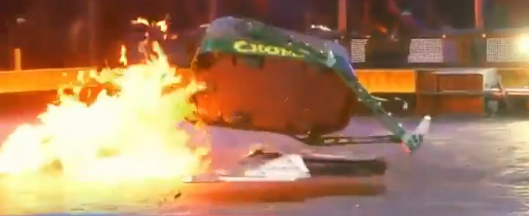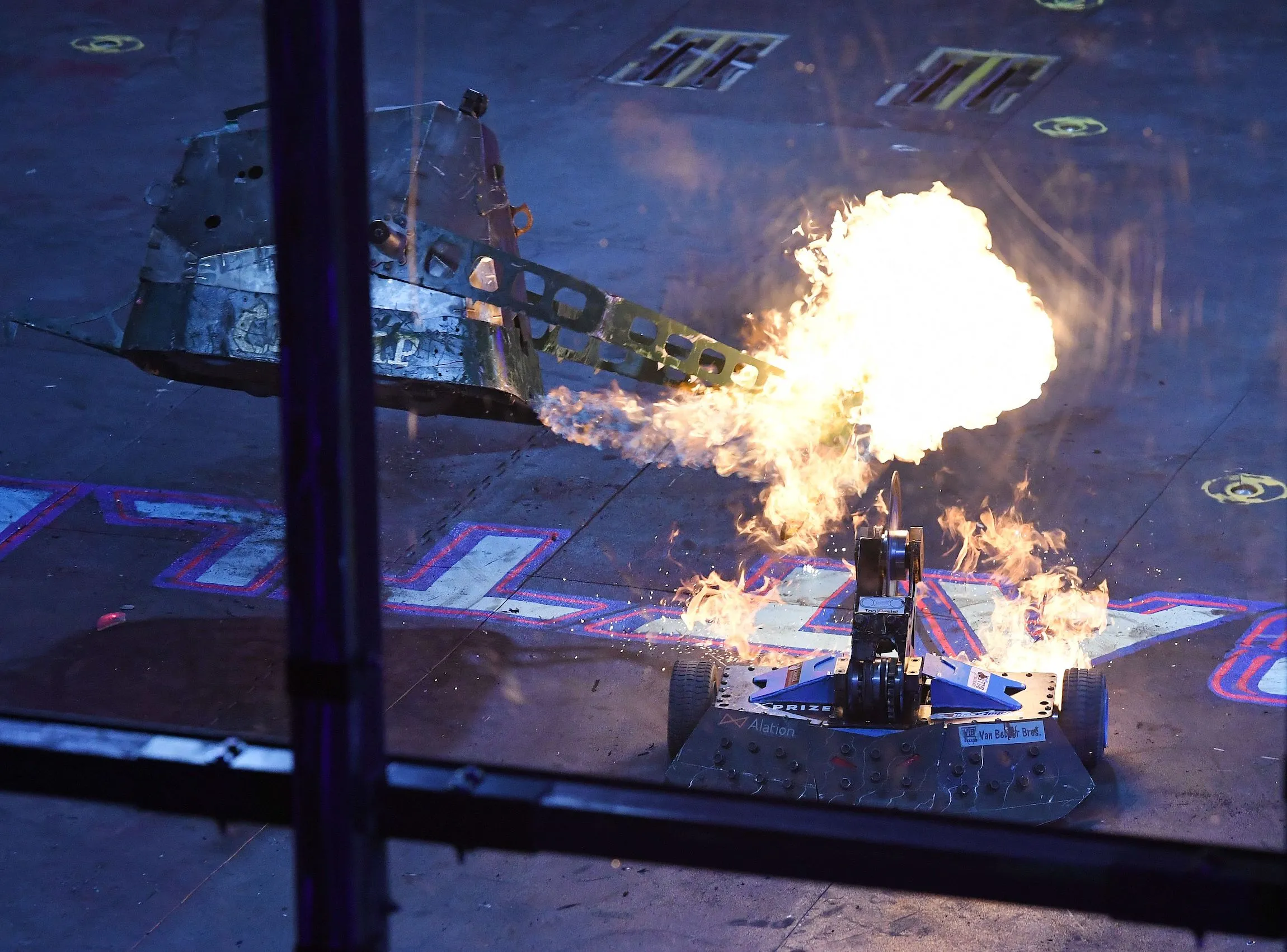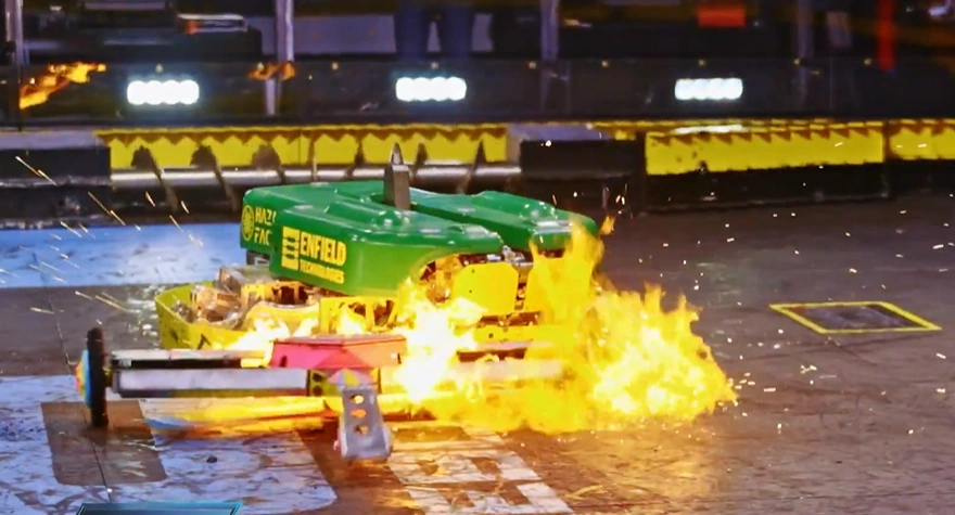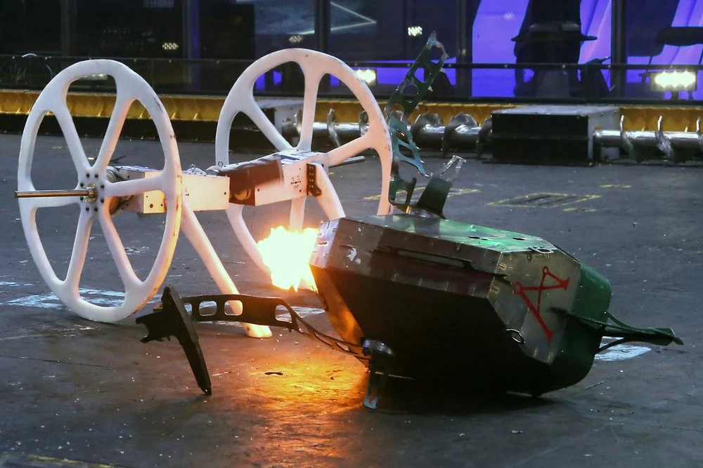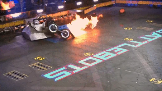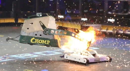 Chomp vs. Bale Spear Chomp's fuel tank fire. |
