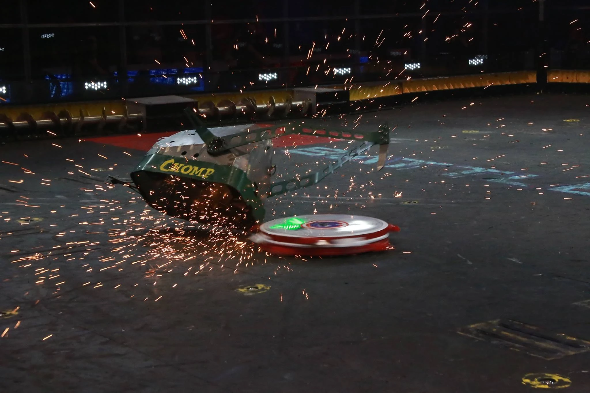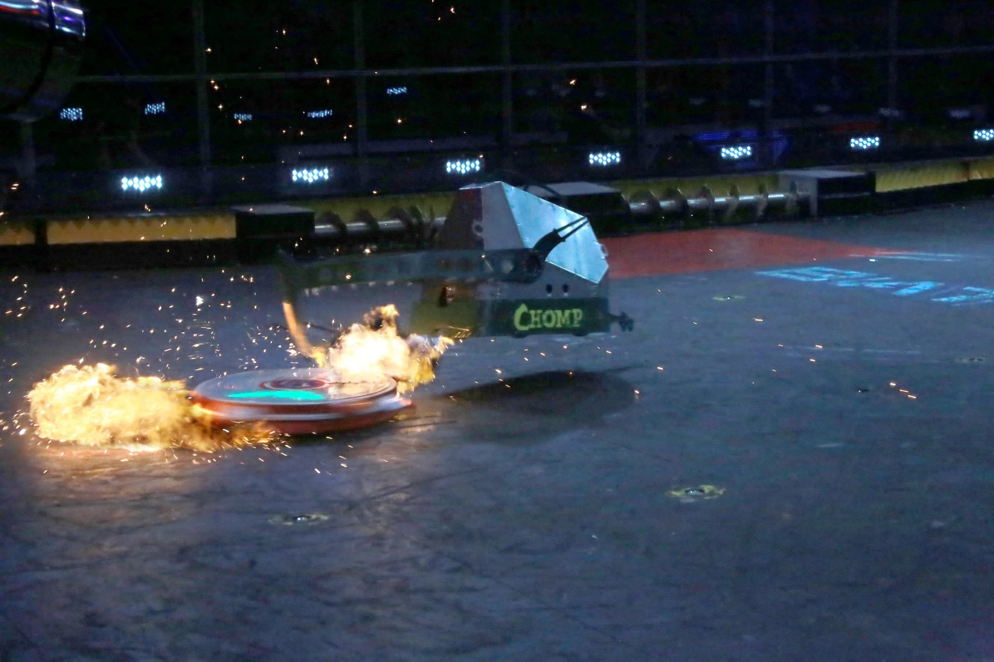 Chomp vs. The Disk O' Inferno Chomp's first match in World Championship II was against veteran builder Jason Bardis and his latest creation, The Disk O' Inferno. For this battle, Chomp had a U-shaped attachment at the front. Chomp becomes unbalanced. The Disk O' Inferno strikes the underbelly of Chomp. Chomp lands a hit on The Disk O' Inferno.