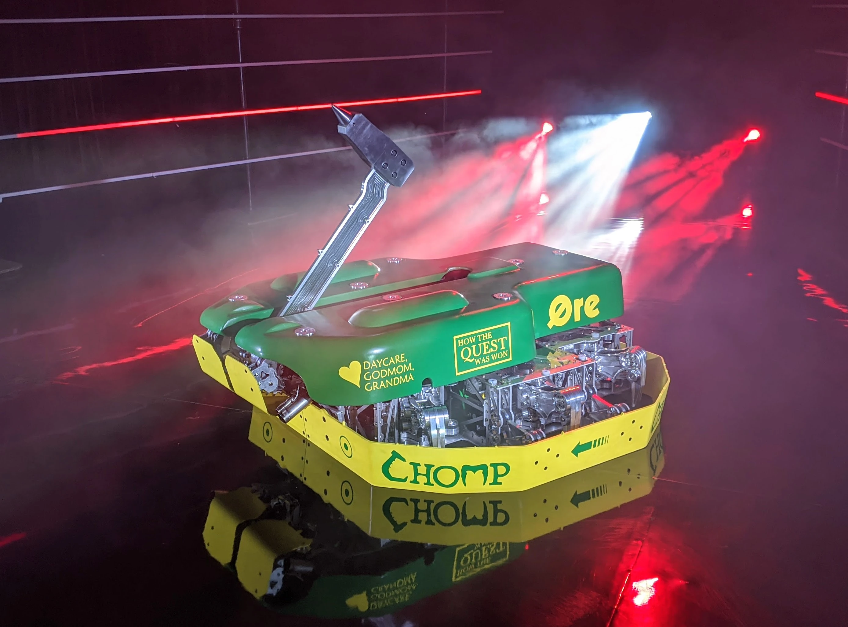Chomp loses its self-righting wing. Yeti sends Chomp into a barrel roll. Yeti looks on as Chomp is counted out. The Machine Corps and their 2016 Founder's Award. |