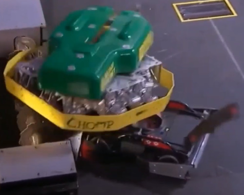 Although Chomp did not overall fare too well in the competition, it was notable for its impressive engineering and unique design in each iteration. The first version of Chomp was armed with a pneumatic crusher and self-righting wings reminiscent of Razer. Ahead of the season, team captain Zoe Stephenson and an armorless Chomp joined Chris Rose and Kenny Florian in a promotional piece for ABC. Chomp's weapon power was demonstrated, as it crushed a television monitor with ease.[1] However, in battle, Chomp lost in its debut battle to veteran Christian Carlberg and OverDrive. Despite being the first robot to receive a wildcard and be reinstated in the competition, Chomp was brutally destroyed at the hands of Icewave and was eliminated for good.