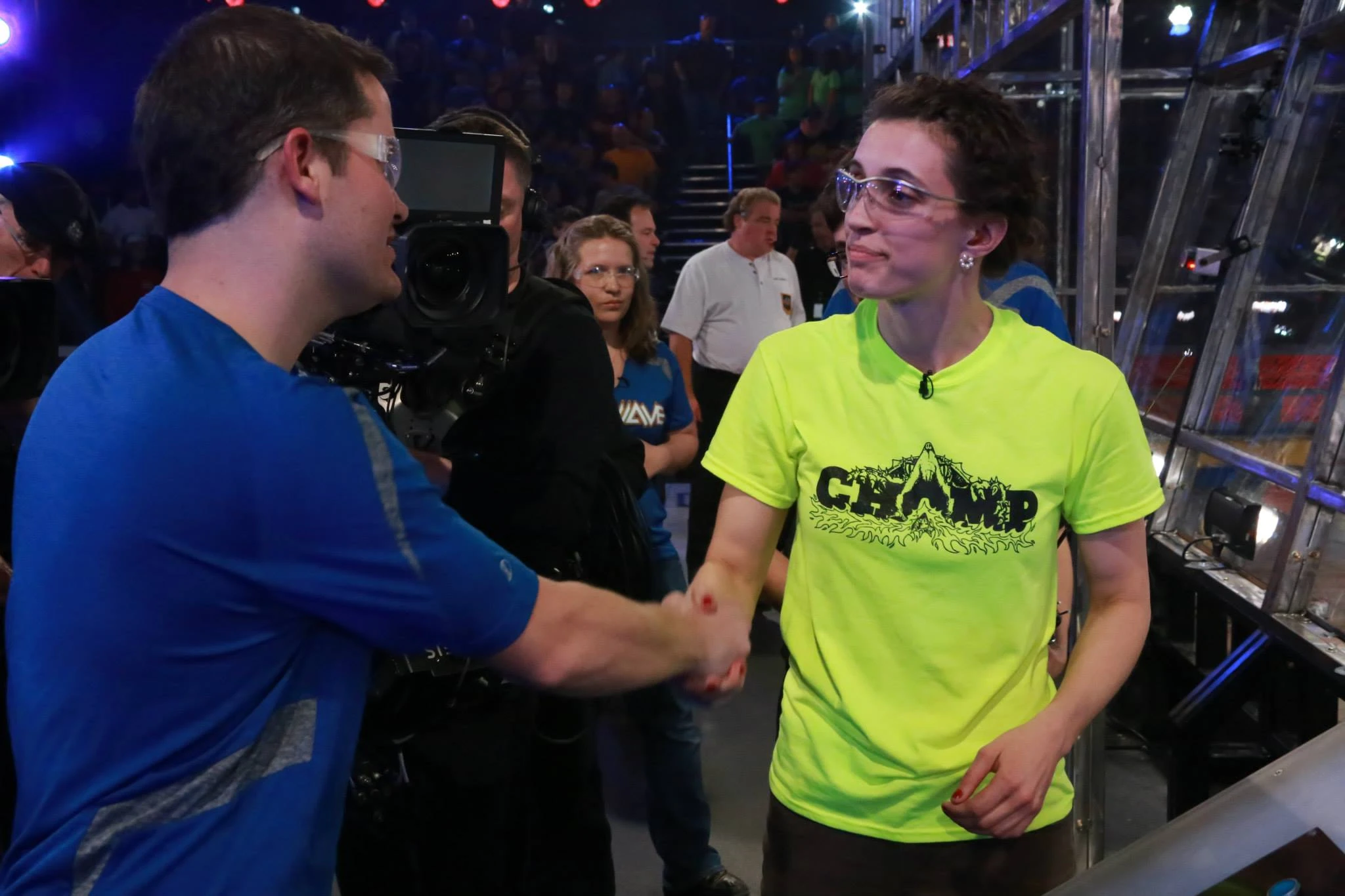 Chomp vs. HiJinx Chomp is struck by HiJinx. It was revealed that HiJinx had utterly wrecked five of Chomp's legs, which had to be completely disassembled and rebuilt. Chomp was not selected to enter the Top 32 tournament bracket and was therefore eliminated at this stage. Zoe Stephenson and Jascha Little hold their Giant Bolt. |