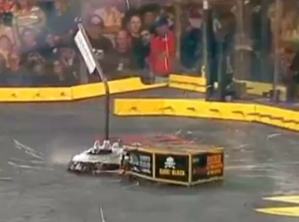 Code:BLACK vs. Wedge of Doom Wedge of Doom surges into Code:BLACK, keeping Code:BLACK's blade from reaching full speed in addition to problems Code:BLACK was having as result of its belt tensioner not working properly and having no spare belts of the right size. Wedge of Doom scoops up Code:BLACK and brings it into the pulverizer. Code:BLACK flees but Wedge of Doom scoops it again and brings it back into the pulverizer. After escaping, Code:BLACK again fled but Wedge of Doom pinned it on the spikes, before carrying it to the screws, and then the pulverizer. Wedge of Doom suffered a blow from the latter, but Code:BLACK lost all power at this moment. Wedge of Doom won the fight by KO and Code:BLACK was eliminated from the tournament. |