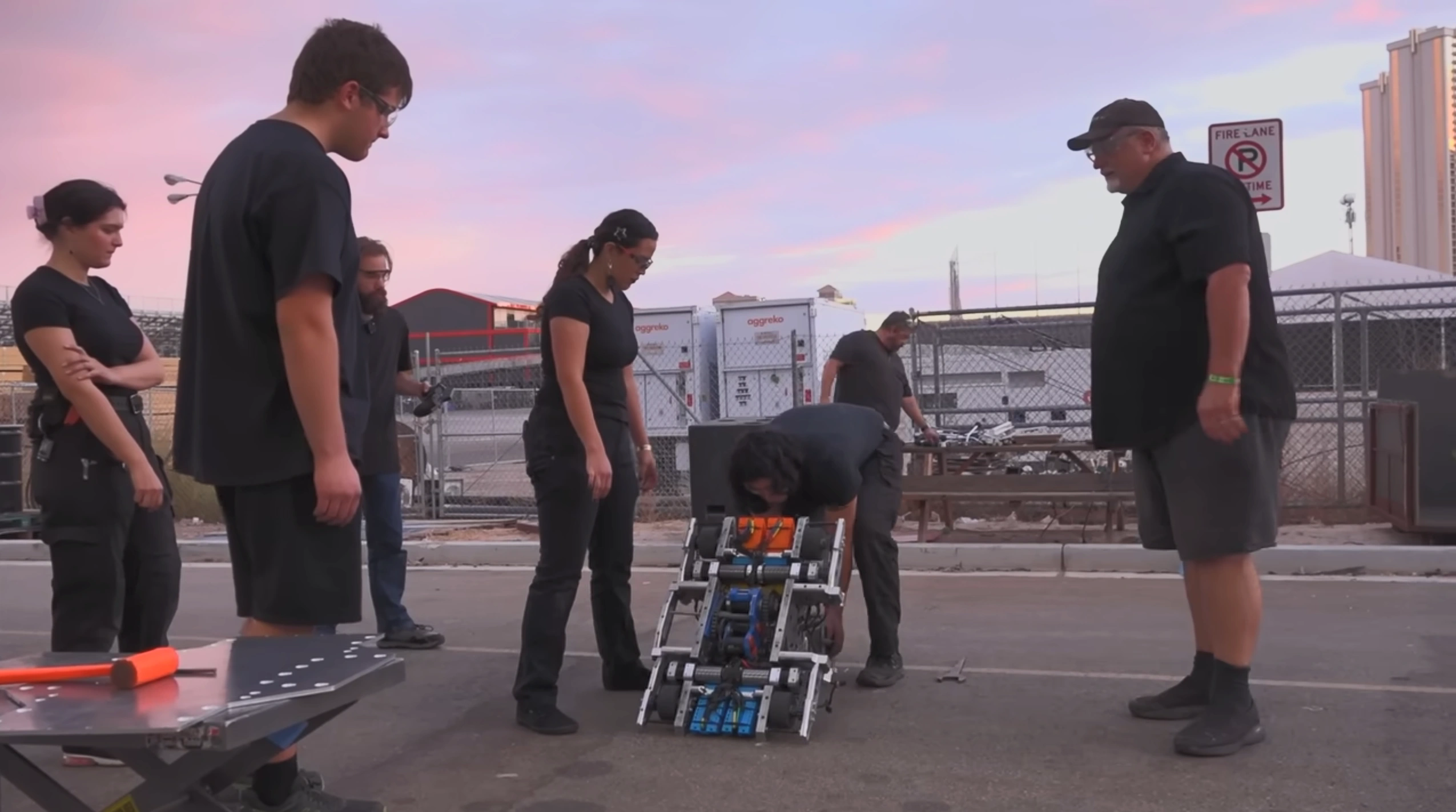 DOOM vs. Magnitude Next to face DOOM was Magnitude, an eggbeater spinner captained by veteran builder Chad New. Team APT conducted a BattleBox drive test, which uncovered an issue with one of the robot's ESCs expiring and needing replacement. Alejandro Pina added that DOOM's spinner was not working at full speed, but was confident about the drive and weapon systems being fully operable in time for the match.