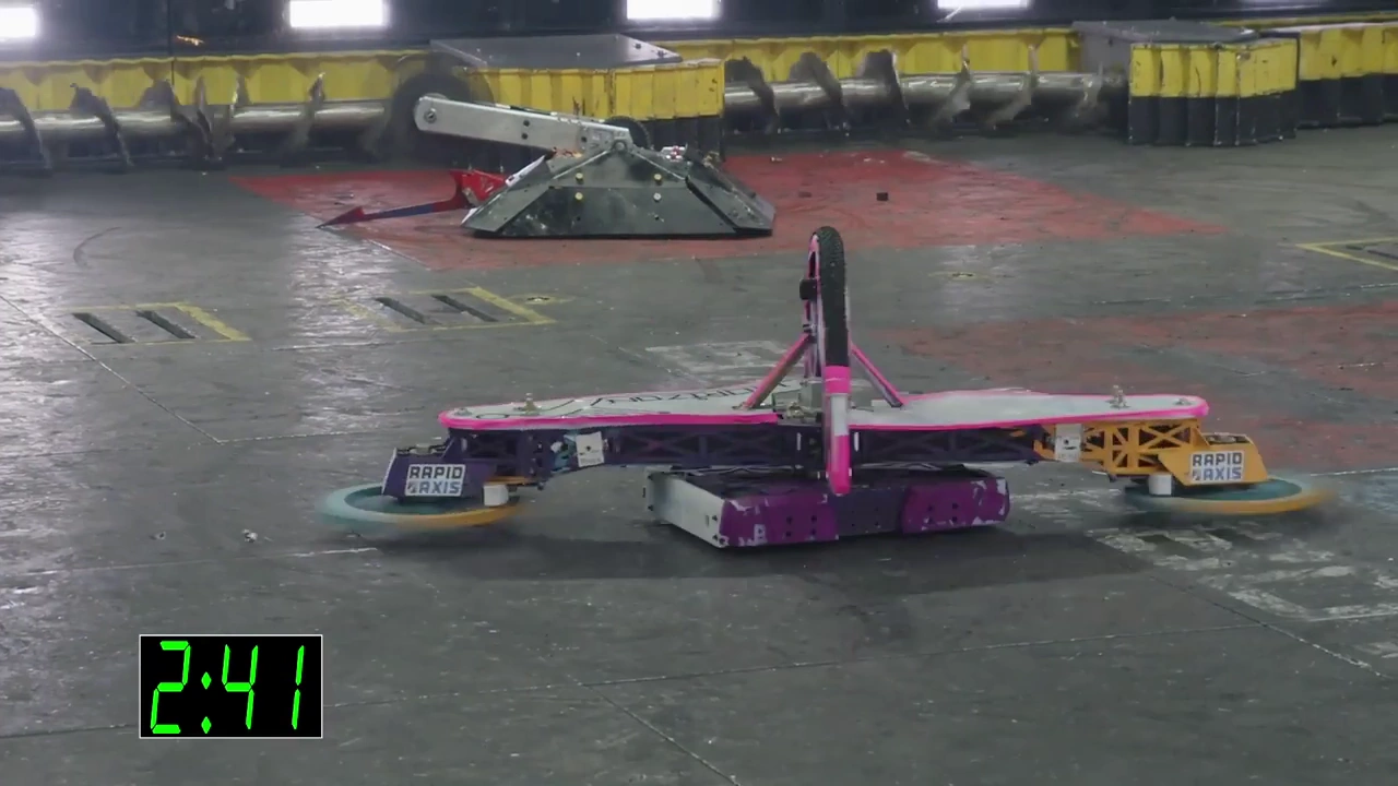 DOOM carves into OverKill's wheel. OverKill then adopted a makeshift sit-and-spin technique, but was scooped up by DOOM and driven to the opposite side of the arena. DOOM landed another swing of its weapon, this time on the blade of OverKill, before driving away again. The Team APT bot returned to the corner with its weapon at full speed, aiming for the remaining tire of OverKill as it landed a glancing blow to the ShowBot. DOOM's fortunes turn. OverKill post-fight. |