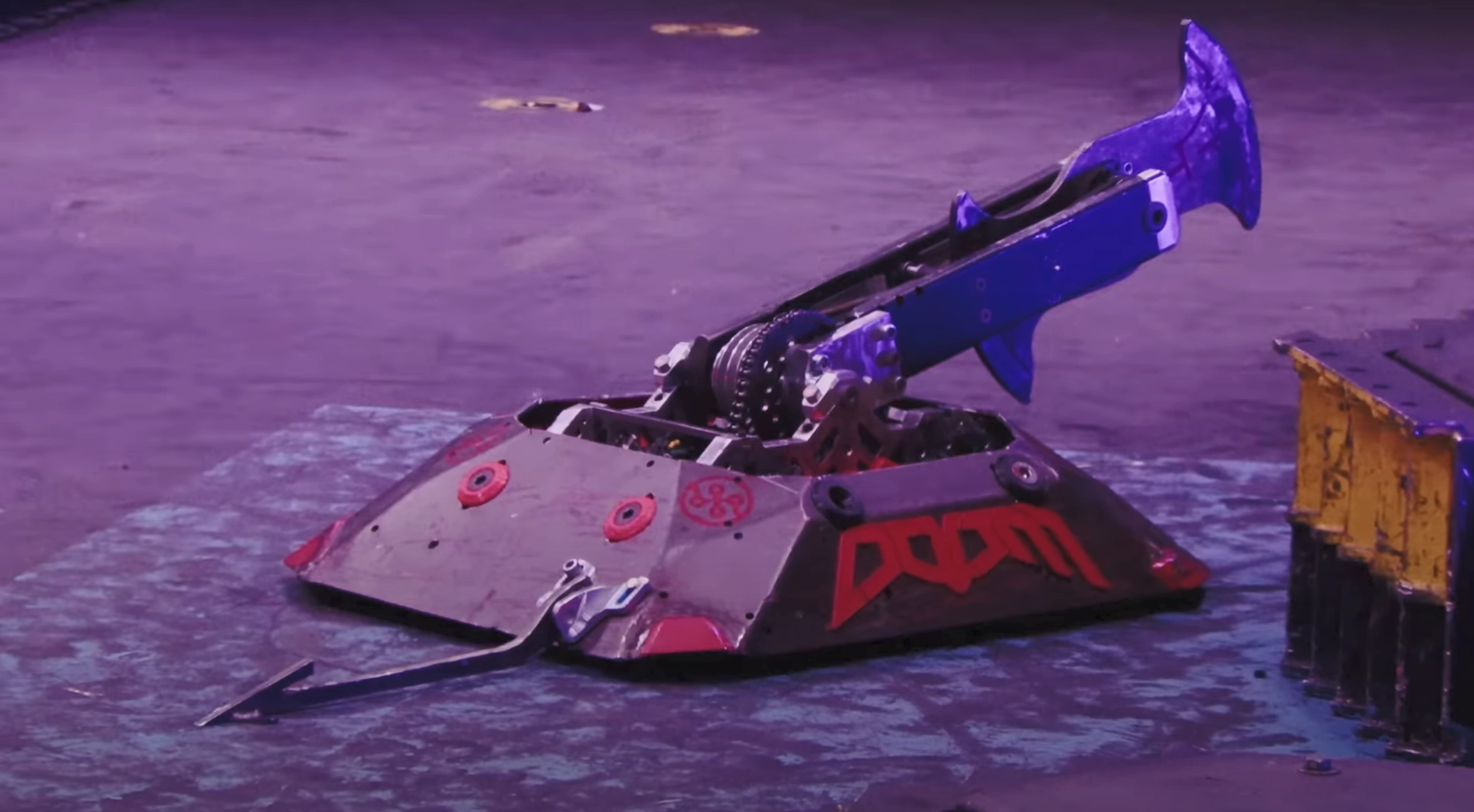 It is a four-wheel drive, largely pyramid-shaped robot armed with a disk or bar spinner attached to an articulating arm, designed to function like a hammer saw. DOOM's armor configuration and overhead weaponry bears a strong resemblance to British veteran Beta. Team captain Alejandro Pina began designing the first iteration of DOOM in January 2021, where it originally sported a triangular disk measuring two feet in diameter. Much like Glitch and Shatter!, Each of its CAD models showed DOOM sporting omniwheels for mobility, though this idea was scrapped for the final build.
