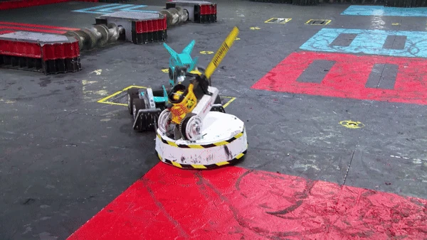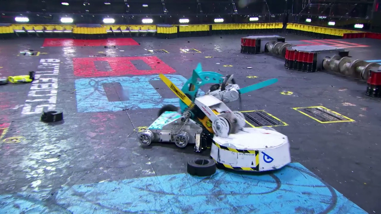 Doomba takes out a weapon chain on Dragon King. When Dragon King closed in once more, Doomba flailed its chainsaw around, raising it far enough over itself to make contact with Dragon King's right-hand saw. Moments later, it was pinned against the bottom-right bumper, though its chainsaw became snagged in the arm and chain for Dragon King's right-hand saw. Doomba struggled to pull its weapon out, though its opponent's weapon had also began locking up in the exchange. Suddenly, Doomba snapped its chainsaw down, which was enough to break the chain off of Dragon King's saw arm.
