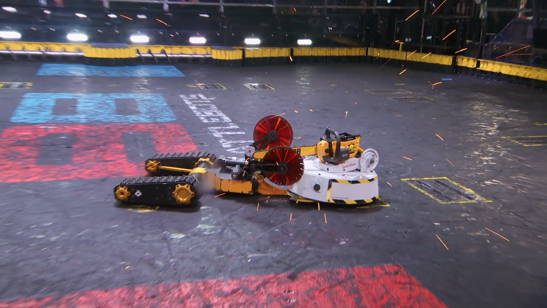 Doomba made a temporary excursion to the bottom-right killsaw slots,[10] before ramming the side of Dragon King and weaving across the inner perimeter. It lowered its chainsaw just as Dragon King initiated another clamping attack, enabling the latter to again cut into the weapon. Doomba was pushed back in circles, and broke free while raising its chainsaw back up. However, while reversing, it got itself stuck on the killsaw slots opposite the control booth. Again, both robots broke free, with Doomba briefly getting itself stuck on the killsaw slots opposite the control booth. In this predicament, it took more damage from Dragon King's right-hand saw, and swung its chainsaw down again while being driven around into the bottom-right corner.