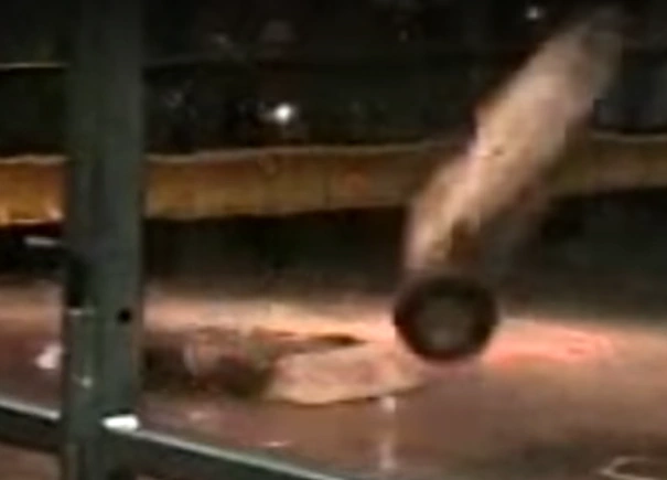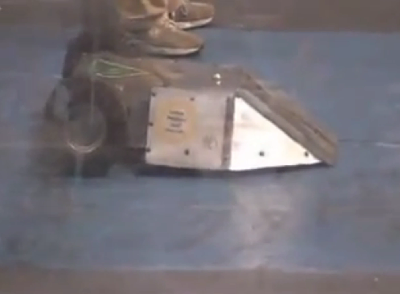 E2V2 vs. The Blender The Blender hits the side of E2V2. Advancing deep into another BBIQ tournament, E2V2 faced The Blender. In the starting seconds of the final, E2V2 interfered with The Blender's spin-up. The wedge continued to deflect the hits, managing to unbalance the shell spinner once. The Blender quickly regained stability and struck the defending champion's wheel and a side. E2V2 was knocked from its side and its back but the wedge held up. However, a few more hits and final strong blow assured the immobility of E2V2. E2V2 would place second in this competition. |