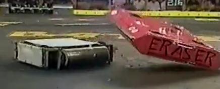 Middleweight Consolation Rumble Eraser was repaired in time for the Middleweight Consolation Rumble, fighting aggressively but eventually getting a drive chain severed by Sunshine Lollibot. It also took some damage from Blade Runner, but it survived the entire fight, one of three others. However, Malvolio and T-Wrex were declared the winners of the Middleweight Consolation Rumble and Eraser lost overall. |