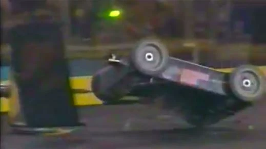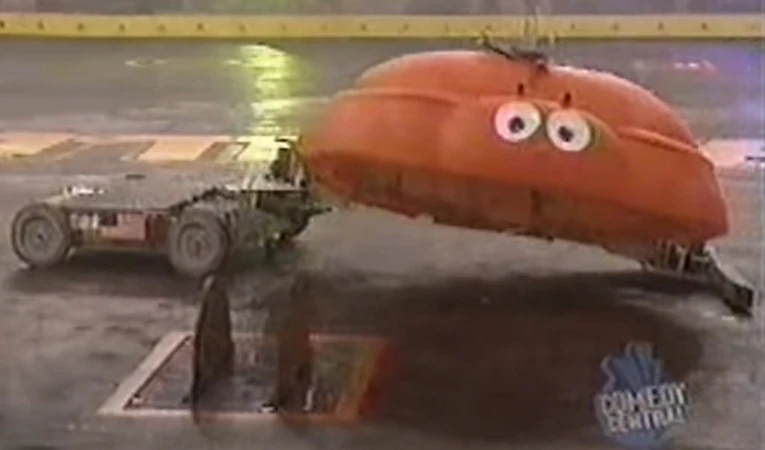In an attempt to re-right itself, Evil Fish Tank spent the next few moments circling around and into the Killsaws nearby. The saws catapulted it into a somersault, then a violent diagonal flip into the center. Evil Fish Tank, still on its back, found itself being scooped up by Toe-Crusher after bumping into a Ramrod seam. Both diced - and were mildly diced by - the lower Killsaws. Evil Fish Tank, having one of its tires slashed, kept bumping into the blades before parking beside the Spinner. It waited as Toe-Crusher flung itself into the air via the lower-right Killsaws, though another tentative spell resulted in neither competitor making any significant attacks. As it turned beside the inner-most Killsaws, Evil Fish Tank was buffeted around by Toe-Crusher. It was left stationary with severe clearance issues; the left-rear and right-front wheels were both spinning freely until Toe-Crusher pushed it over the Killsaws themselves.