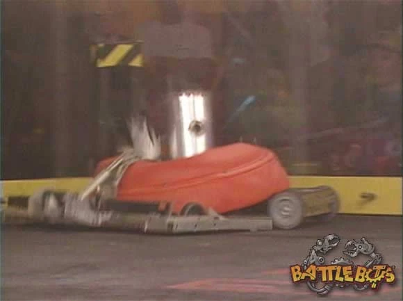 Evil Fish Tank and Toe-Crusher push each other. Starting from the blue square, it charged across the center to lock horns with Christian Carlberg's thwackbot. Though Toe-Crusher won this initial ground game, Evil Fish Tank swerved away to allow its opponent to veer precariously close to a Pulverizer. Evil Fish Tank began a series of aggressive drives, lifting and turning Toe-Crusher over into the nearby Killsaws while resisting a blow from its swinging axe. Following a tentative spell, it launched Toe-Crusher over itself with a head-to-head collision. More rams followed; though able to successfully turn Toe-Crusher's wedge over, Evil Fish Tank found itself being pushed back at high speed into the Killsaws. Evil Fish Tank's wedge gets snapped off by a pulverizer. The Killsaws launched both competitors again at separate moments. Once Evil Fish Tank drove into them, it was completely flipped over and left with noticeable mobility issues in the inverted position. With its pirouettes came a crucial turning point; Evil Fish Tank shuffled directly under and had its lifting ramp broken off by the lower-right Pulverizer. Toe-Crusher axed its base plate as it escaped via the floor Spinner.