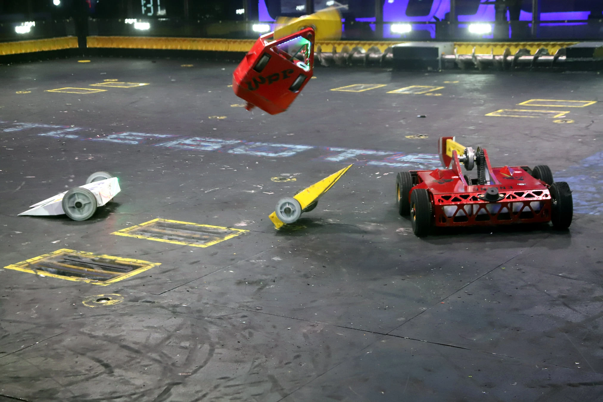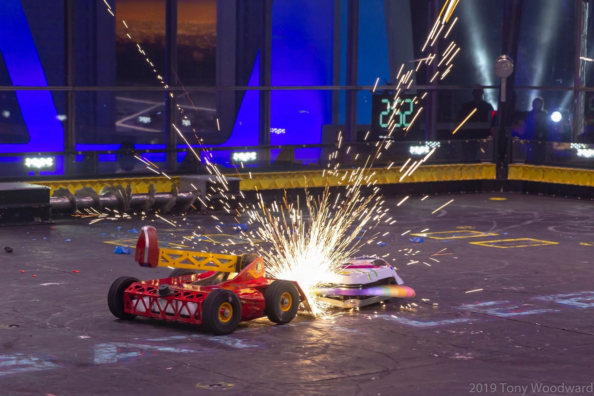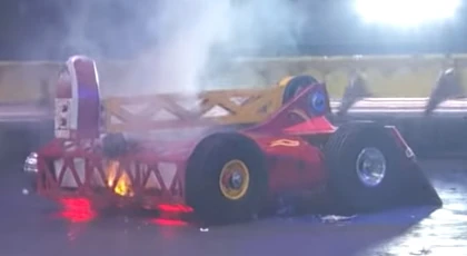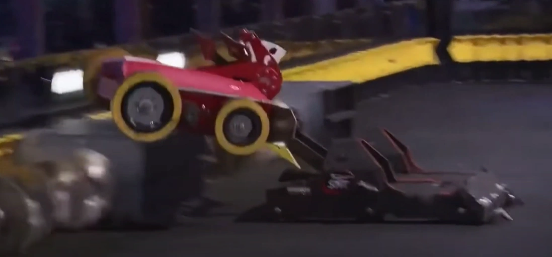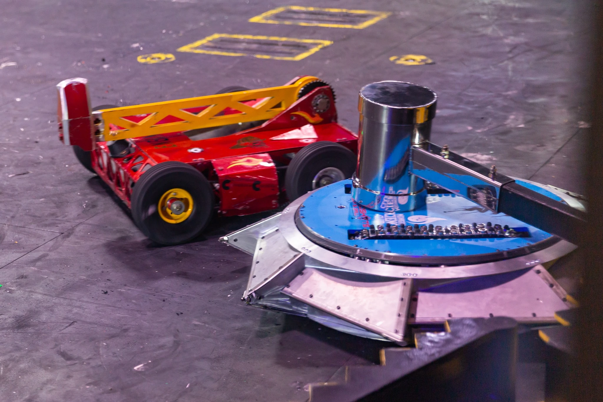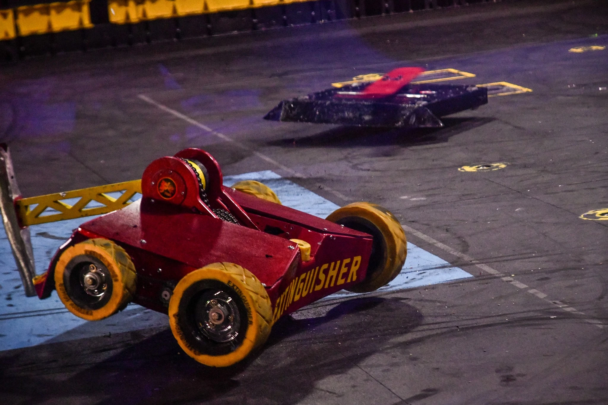 Extinguisher vs. P1 vs. The Four Horsemen one of Extinguisher's tire gets torn off by War. Extinguisher was caught on fire and smoking. Extinguisher also took part in an exhibition rumble with The Four Horsemen and P1. The rumble was off to a good start for Extinguisher as they were able to land hits on both The Four Horsemen and P1 with P1 losing its sacrificial spoiler. Unfortunately, Extinguisher was then lifted by P1 before losing a tire and being pushed onto the screws. Extinguisher escaped but was down to one side of drive and began smoking. To make matters worse, P1's minibot, Burnout, got under and ignited a LiPo fire inside Extinguisher with its flamethrower, which grew bigger and bigger as the match went on. Extinguisher's remaining drive stopped working and eventually lost the use of its hammer too. Extinguisher kept using its siren to keep the fire low as much as possible, but due to its battery power running out, the fire grew to such a size that the match was cut off early, bringing the rumble to a judges' decision, which ruled in favor of The Four Horsemen. |