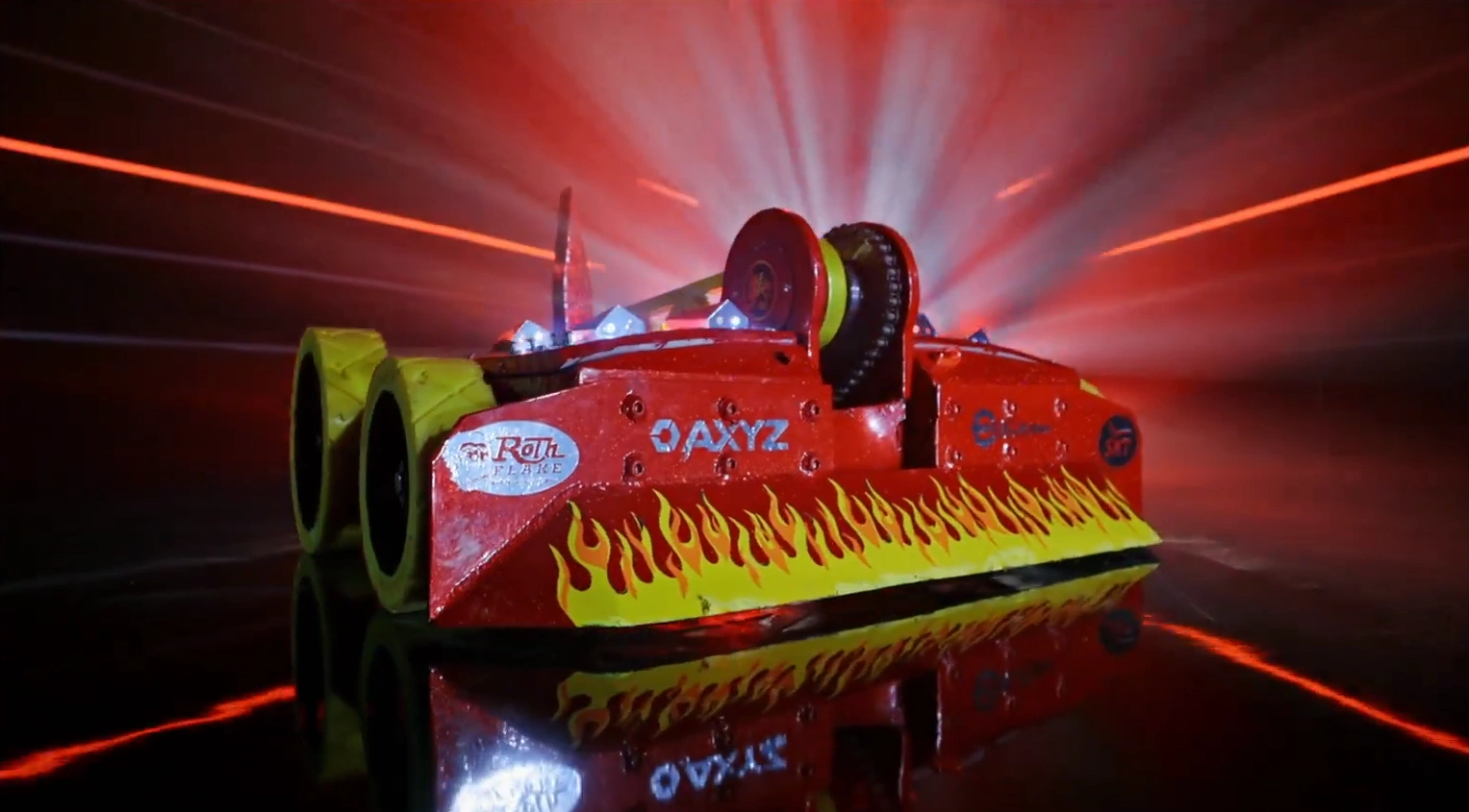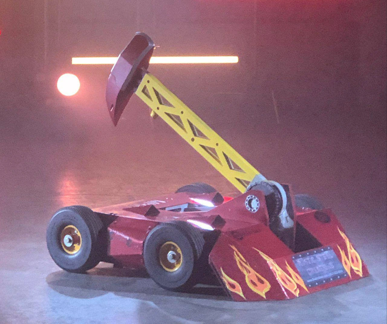 Outside of BattleBots, Extinguisher is a regular competitor at Robot Ruckus events in Orlando, Florida, predating their BattleBots debut. In 2017, Extinguisher was a red, two-wheel drive robot with large wheels and a castor at the front. Its main weaponry came in the form of a large, curved scoop. However, it lost its first fight to Gruff.[2] It returned for the 2018 competition with a similar look but bearing a rust-colored scoop. However, it was easily dispatched of by Mammoth. Extinguisher appeared in its more familiar look in 2019, where it lost to Slap Box by way of a judges' decision.