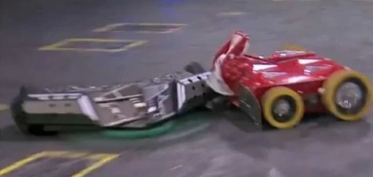 Extinguisher vs. Perfect Phoenix Extinguisher gets hit by Perfect Phoenix. After its extensive upgrades, Extinguisher's first match was against Perfect Phoenix. Extinguisher was armed with its hammer and plow set-up, but started off very poorly as their box rush was side stepped and they ended up hitting the screws hard enough to disable their own drive system. Extinguisher had its paint scratched by its opponent as it was counted out, giving Perfect Phoenix the win by a rather easy KO. |