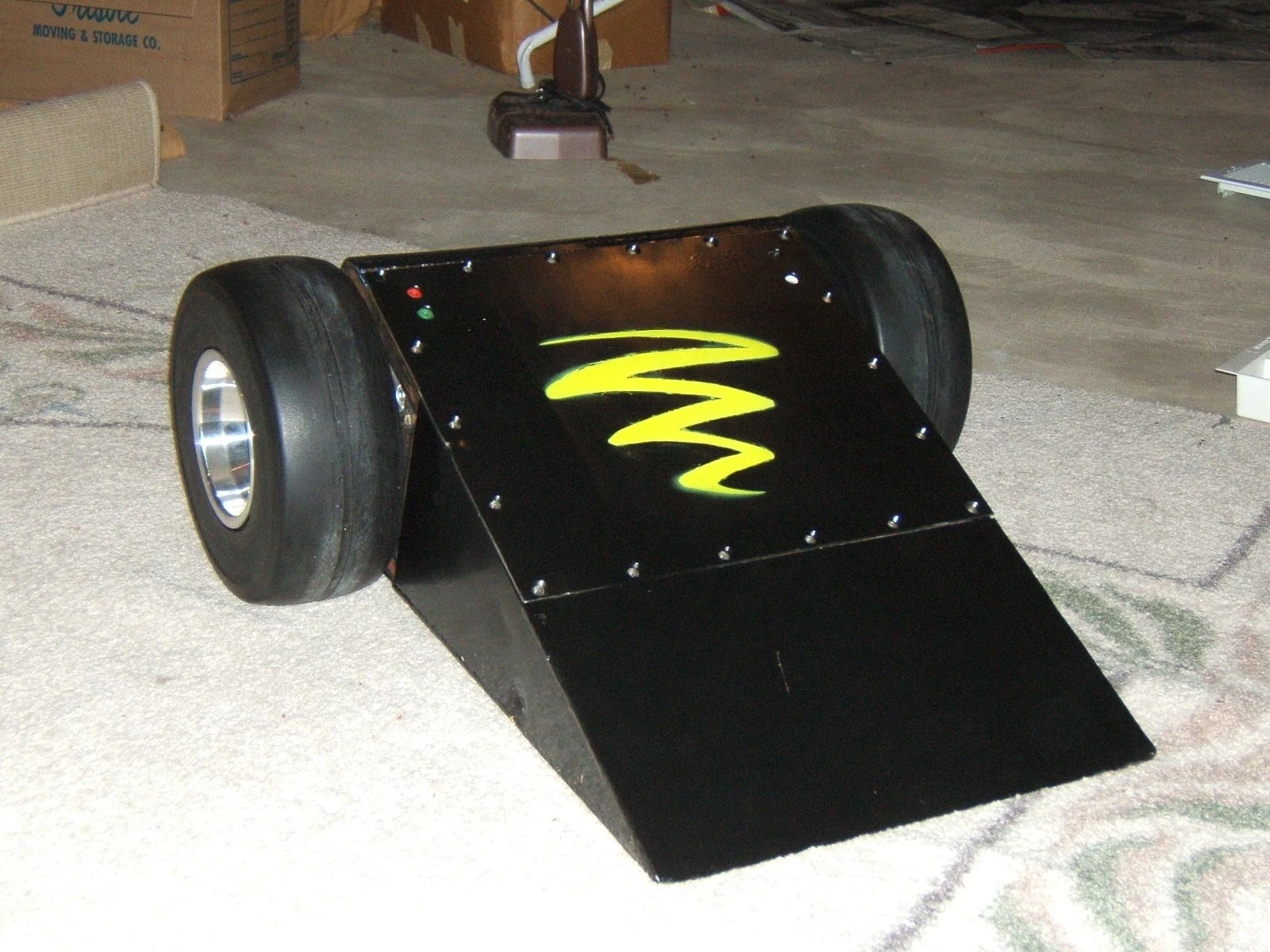 Funnel Cloud was a middleweight robot built by Polybots. It was a black, two-wheeled, invertible wedge-shaped robot with yellow tornado graphics. Funnel Cloud had no active weapon, instead relying on pushing power and its wedge shape.