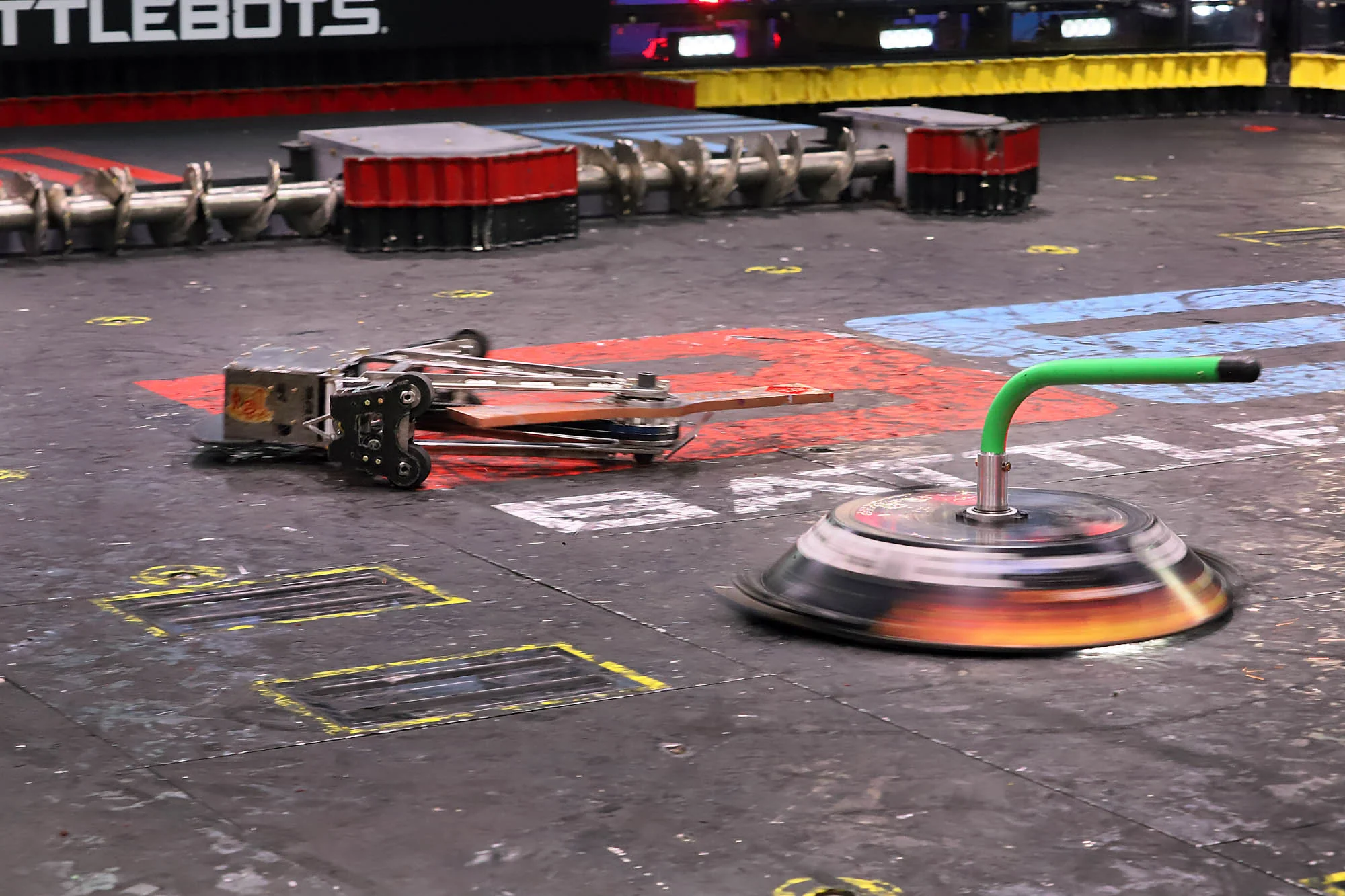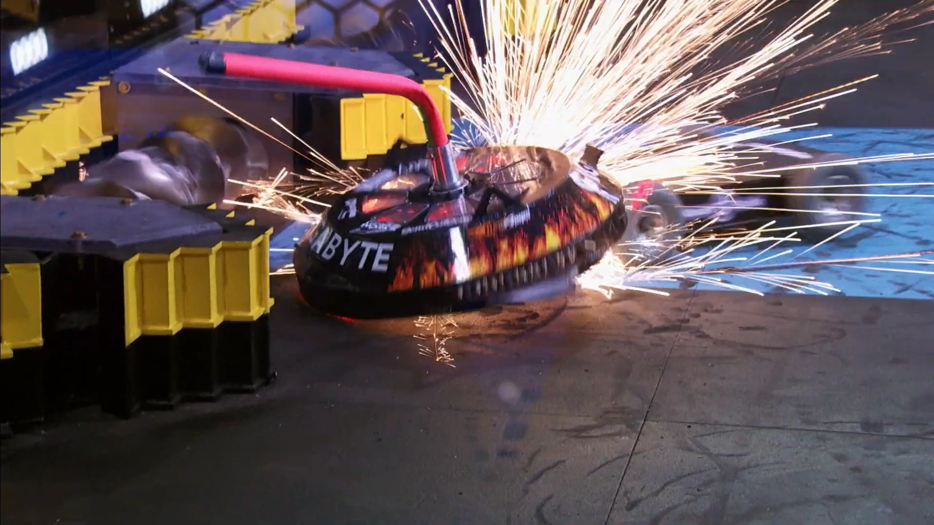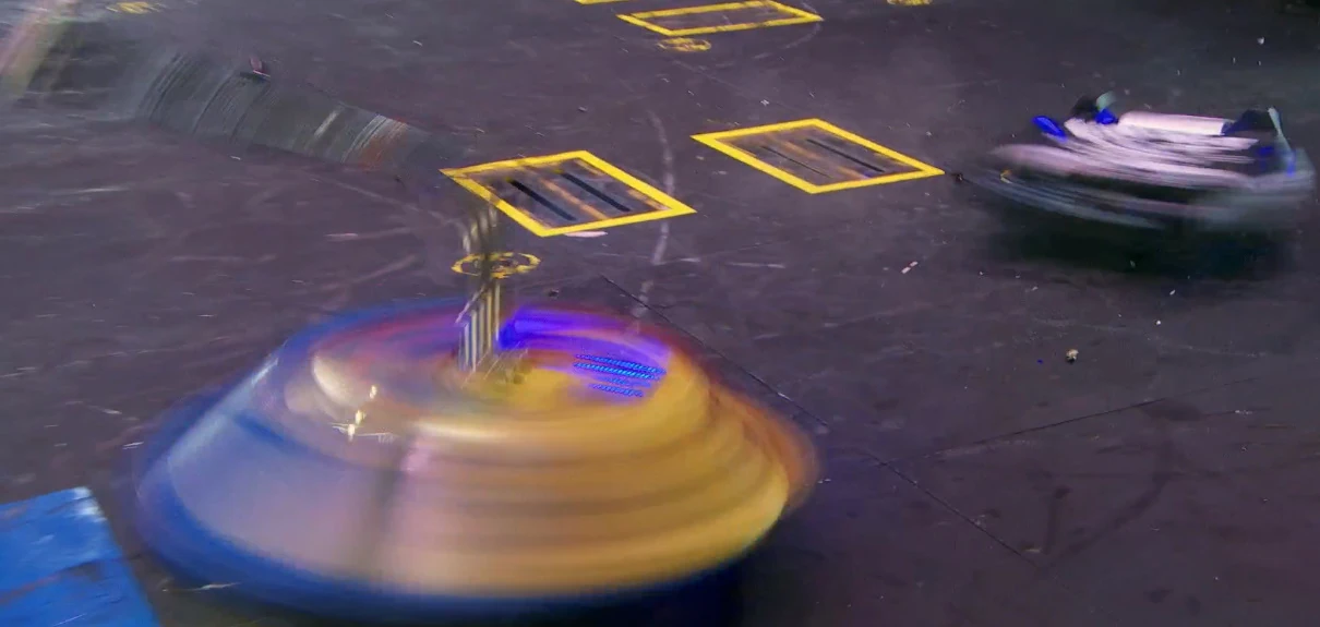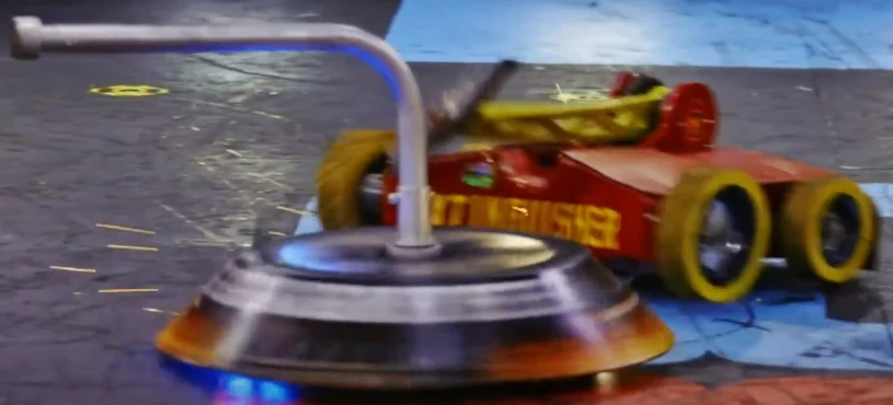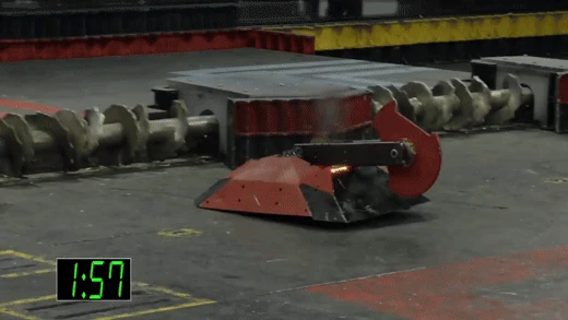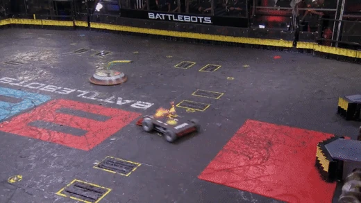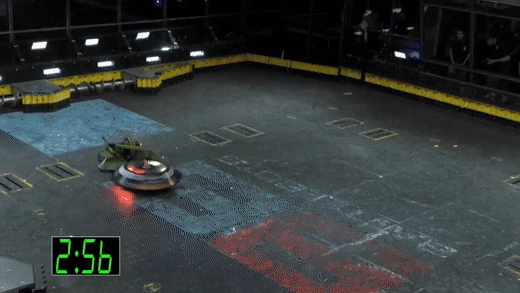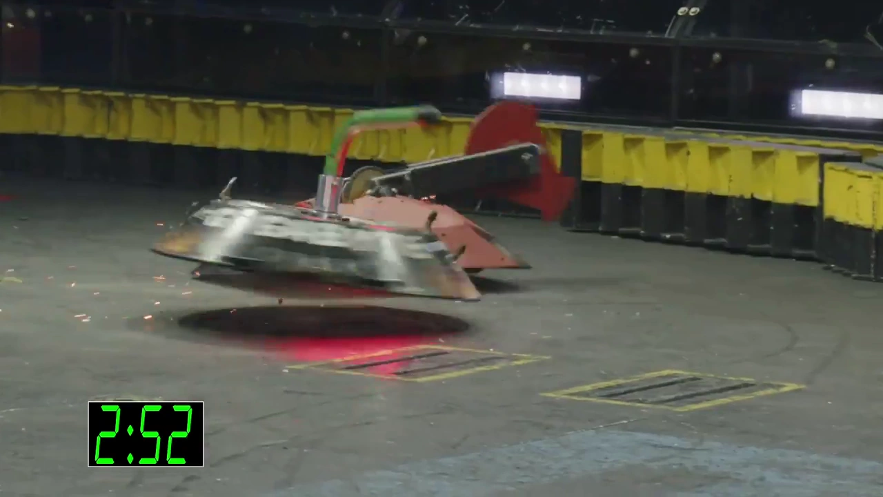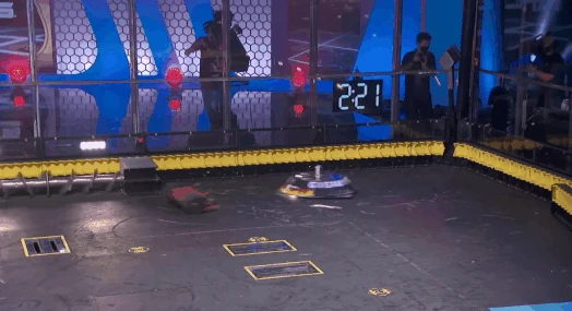 Gigabyte again tried to self-right, but was almost knocked back over as DeathRoll clipped its baseplate. After tanking a few more heavy hits, it headed towards the center, gaining momentum in its shell at the command of Camden Wallraff. Both heavyweights exchanged a second, even more powerful blow between their spinners. While Gigabyte recoiled into the control booth bumper, it caused DeathRoll to flip and carry itself into the red square screws. It swerved around, briefly dodged and survived two more hits from its recovering opponent, while driving towards the right-most Upper Deck screws.