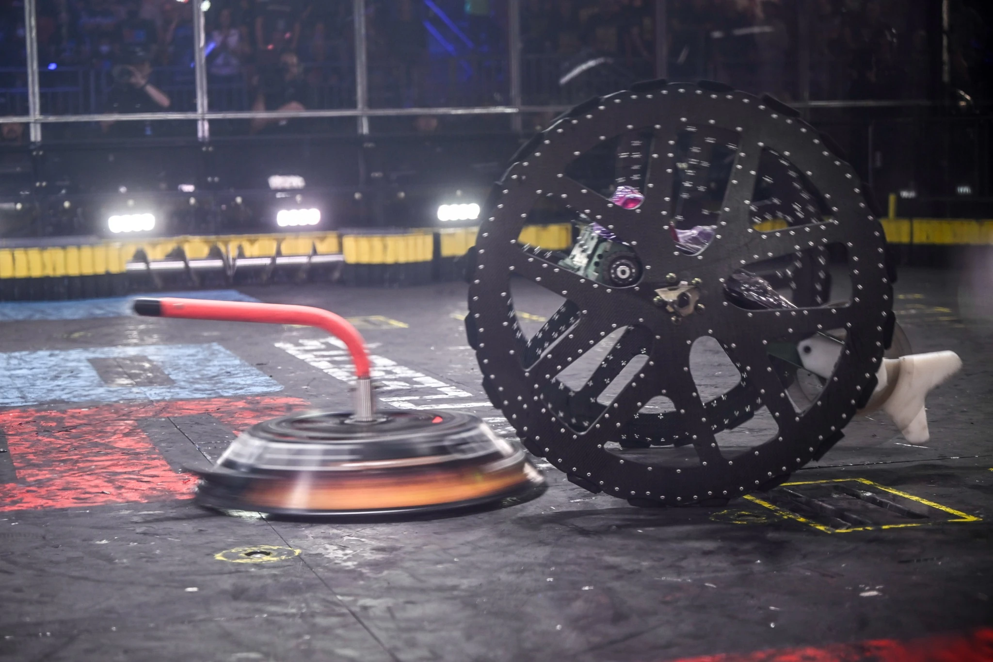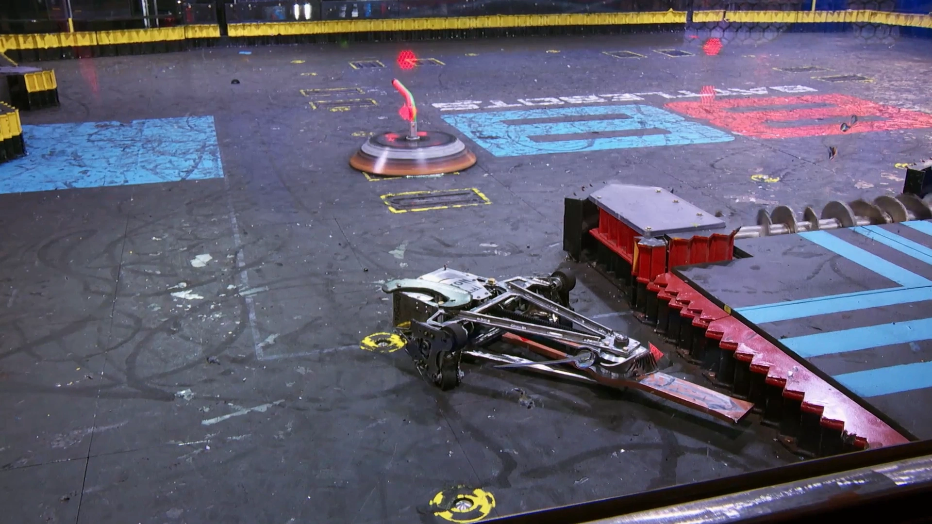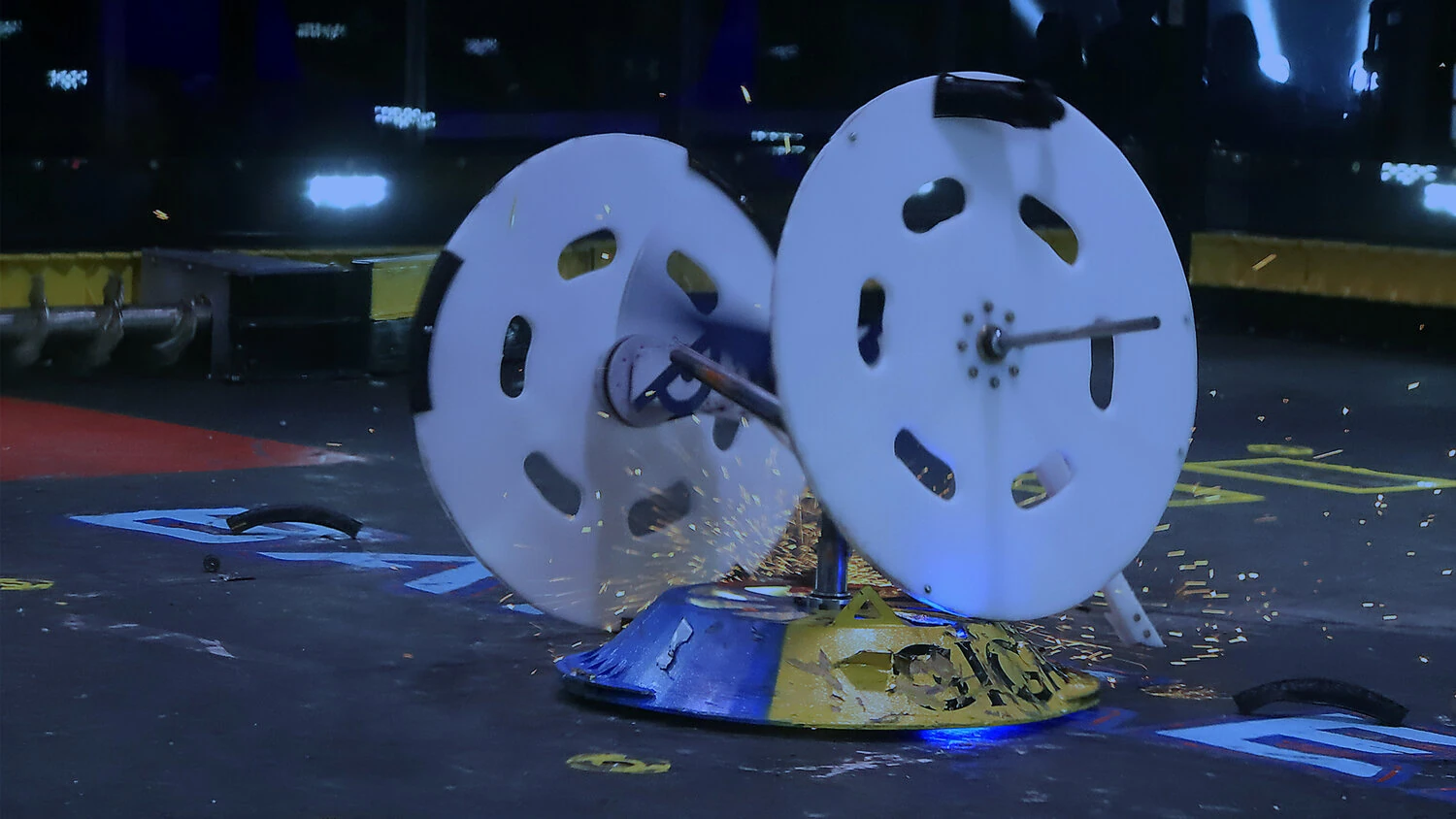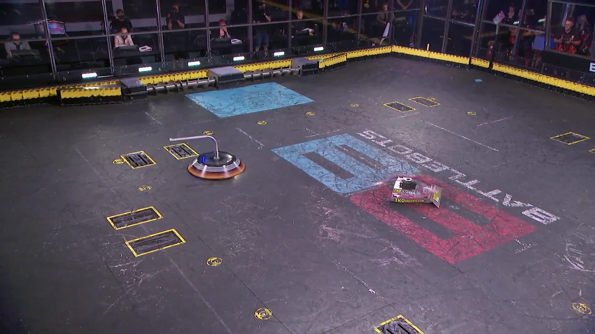 Gigabyte again tried to self-right, but was almost knocked back over as DeathRoll clipped its baseplate. After tanking a few more heavy hits, it headed towards the center, gaining momentum in its shell at the command of Camden Wallraff. Both heavyweights exchanged a second, even more powerful blow between their spinners. While Gigabyte recoiled into the control booth bumper, it caused DeathRoll to flip and carry itself into the red square screws. It swerved around, briefly dodged and survived two more hits from its recovering opponent, while driving towards the right-most Upper Deck screws.