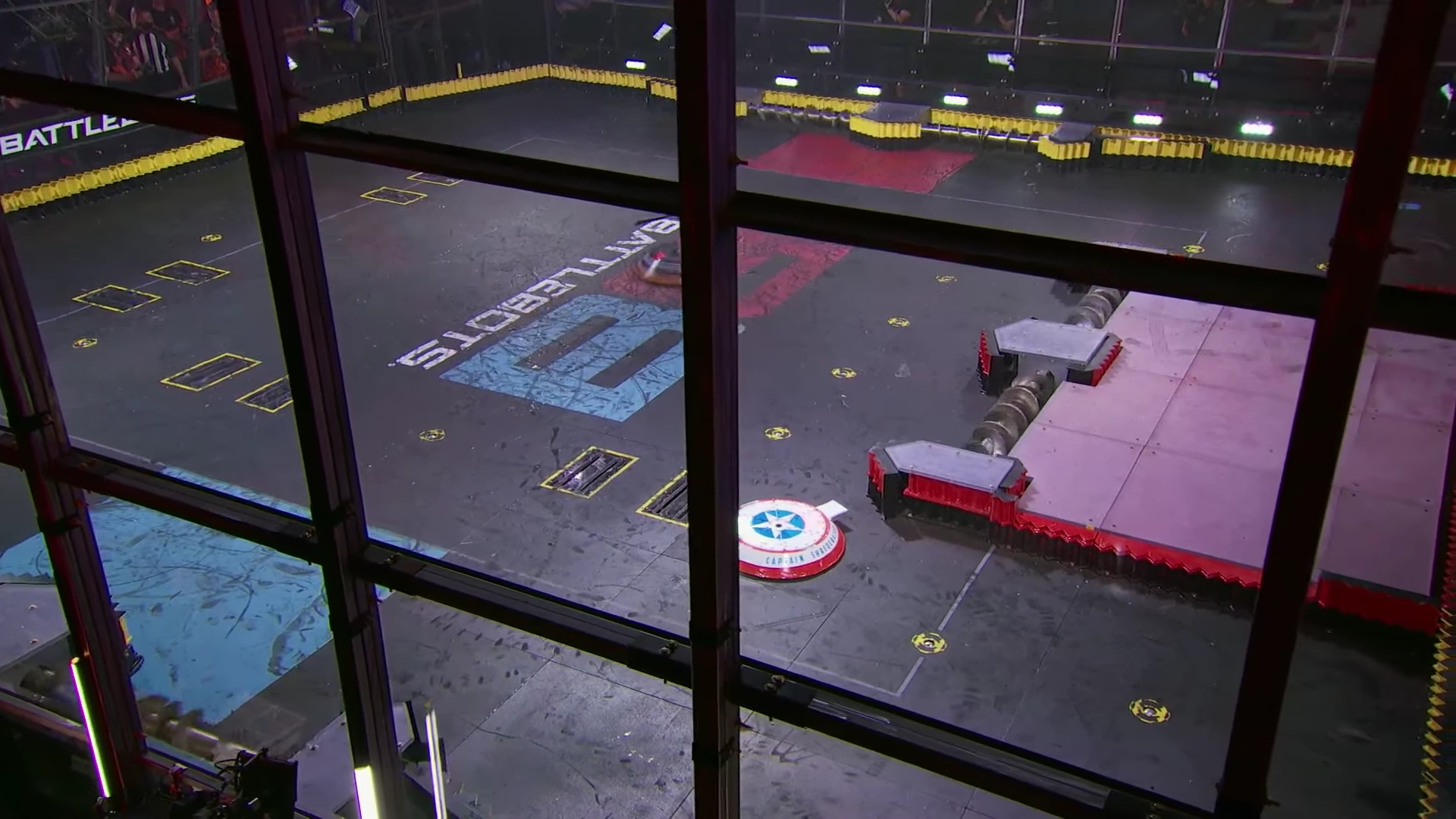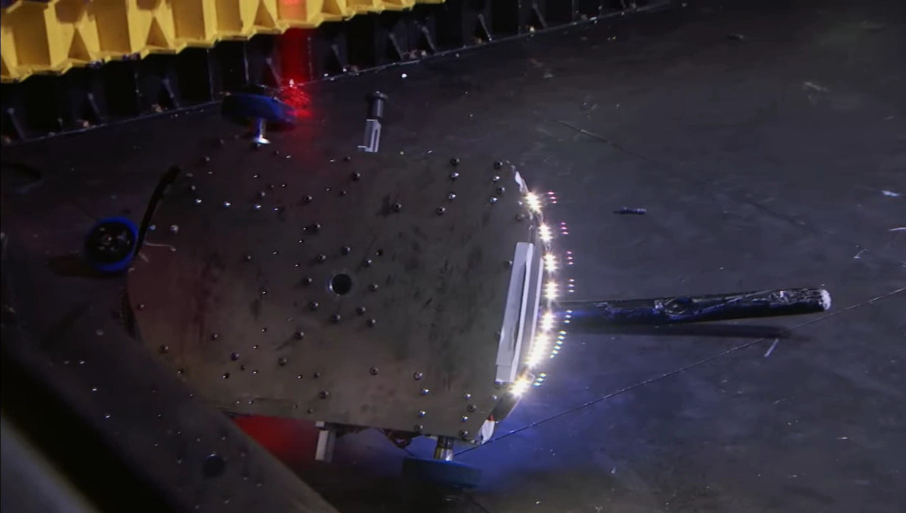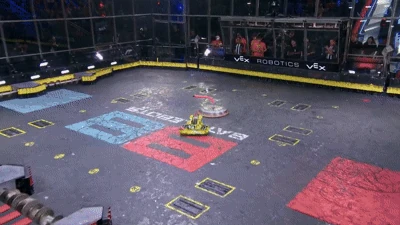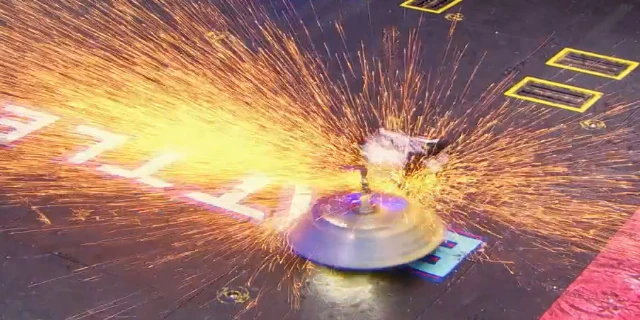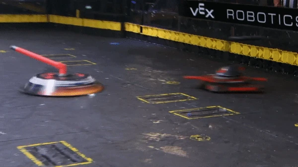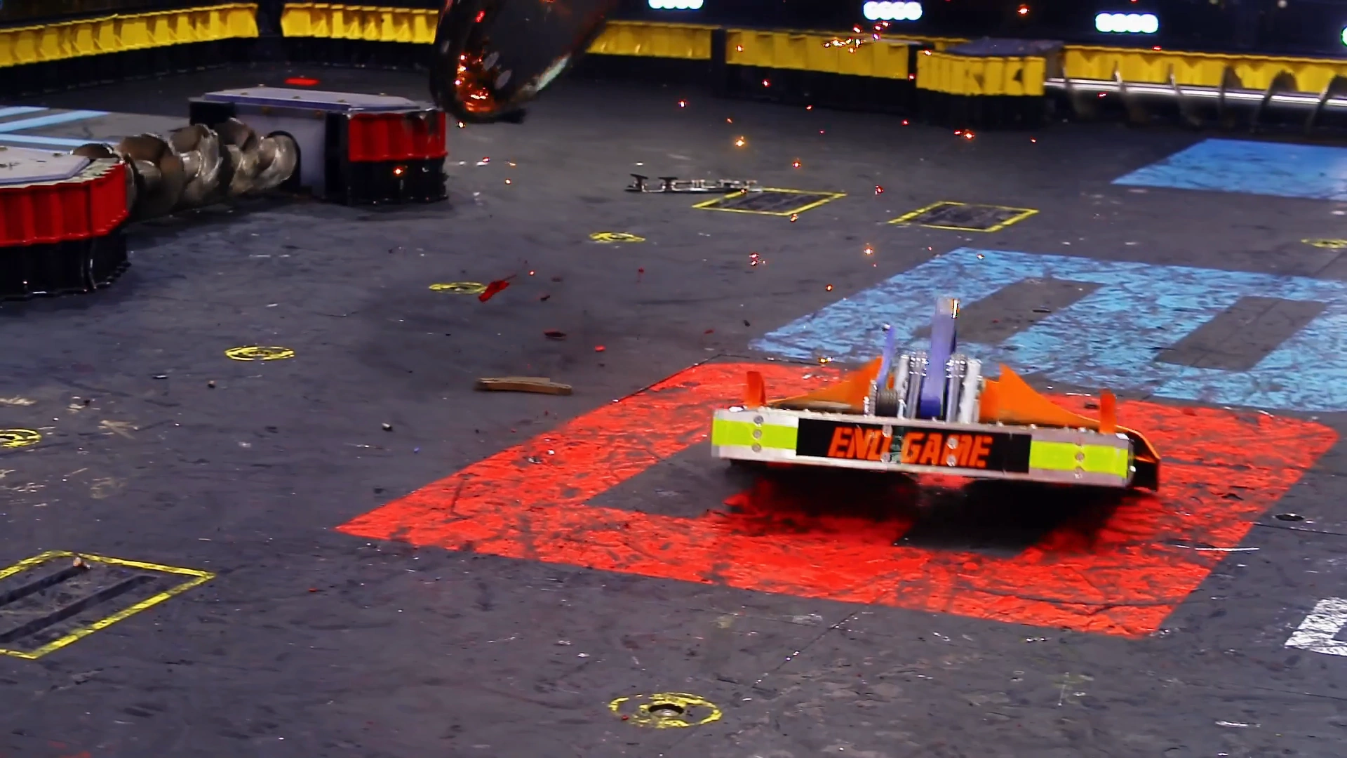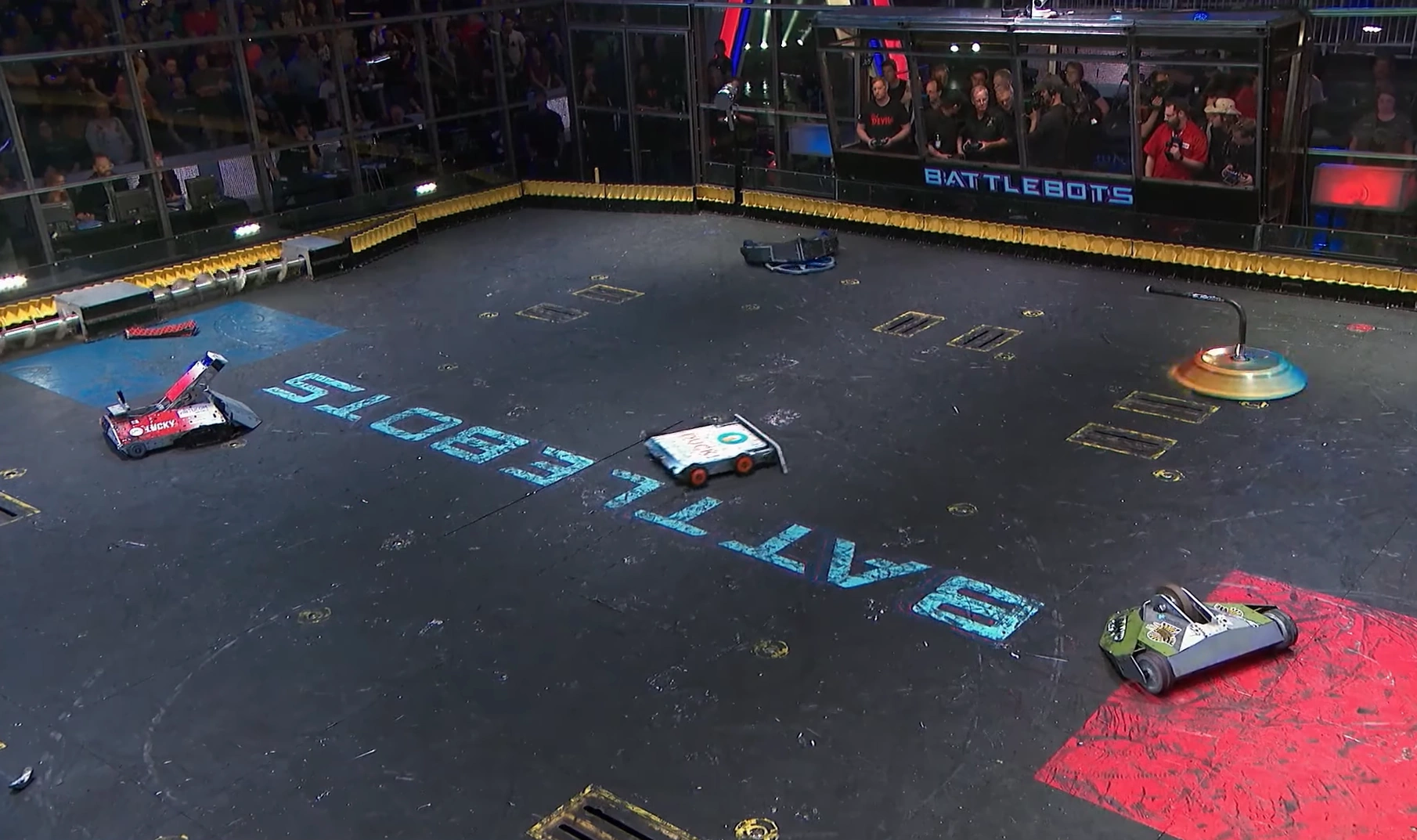 Gigabyte again tried to self-right, but was almost knocked back over as DeathRoll clipped its baseplate. After tanking a few more heavy hits, it headed towards the center, gaining momentum in its shell at the command of Camden Wallraff. Both heavyweights exchanged a second, even more powerful blow between their spinners. While Gigabyte recoiled into the control booth bumper, it caused DeathRoll to flip and carry itself into the red square screws. It swerved around, briefly dodged and survived two more hits from its recovering opponent, while driving towards the right-most Upper Deck screws.