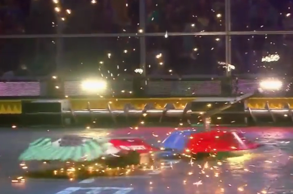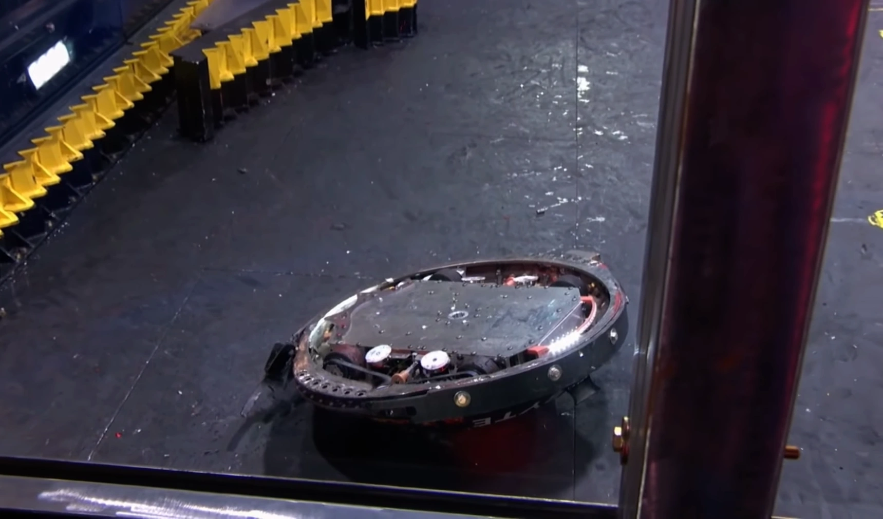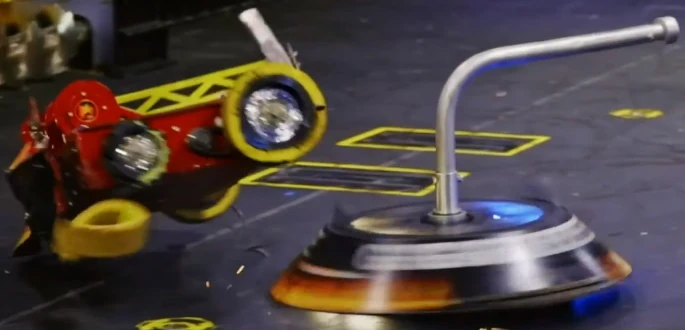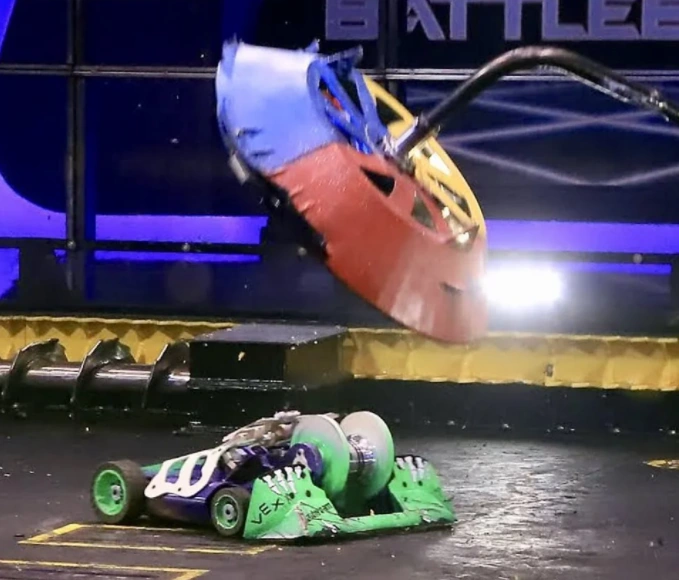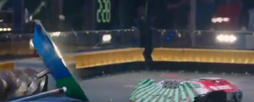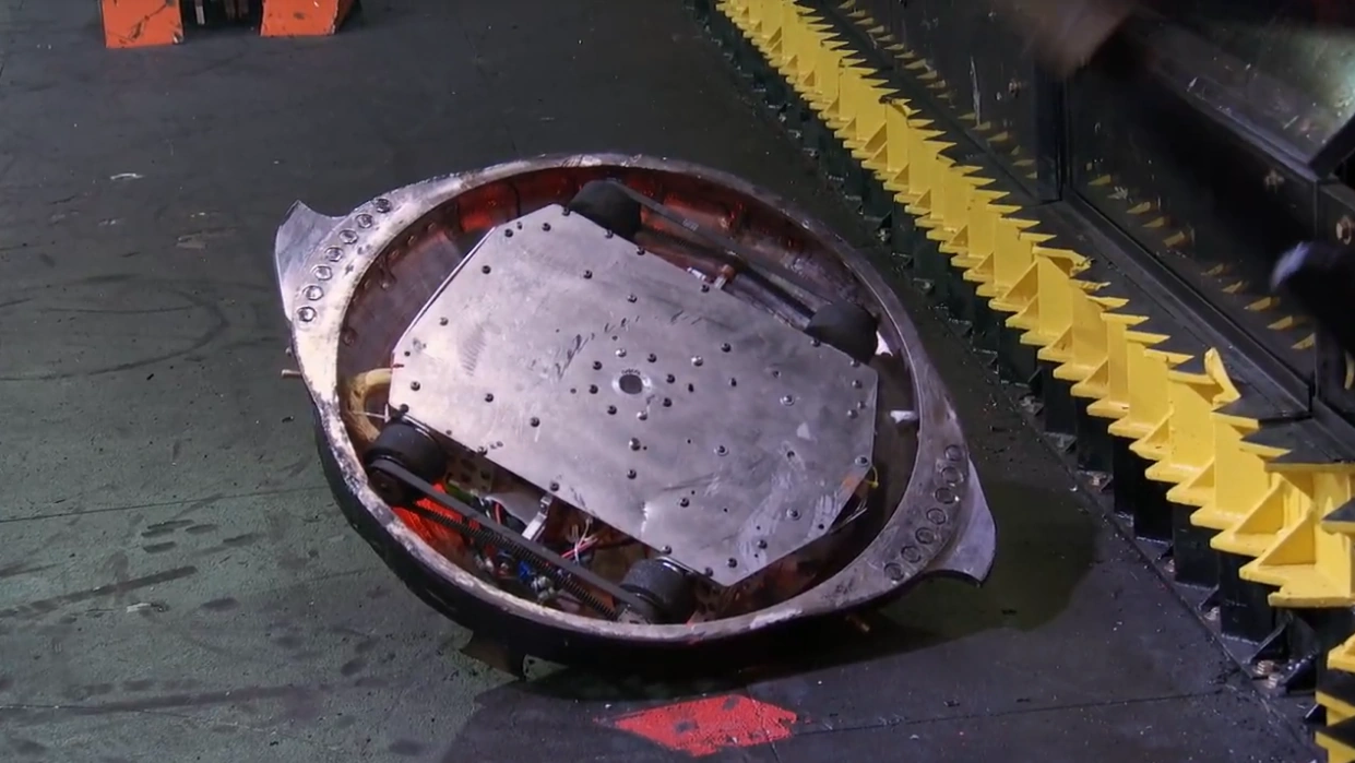 Crucially, as Gigabyte slammed back down onto the floor, the impact also caused DeathRoll to land upside down on top of the bottom-left paddle. Attempts by DeathRoll to free itself and self-right were unsuccessful. Meanwhile, Gigabyte approached and stood close to the paddle, its shell spinning as referee Kathryn Godfrey counted its defeated opponent out. The Robotic Death Company veteran progressed to the Slugfest final following a spectacular bout, though it would not do so without encountering another setback behind the scenes.
