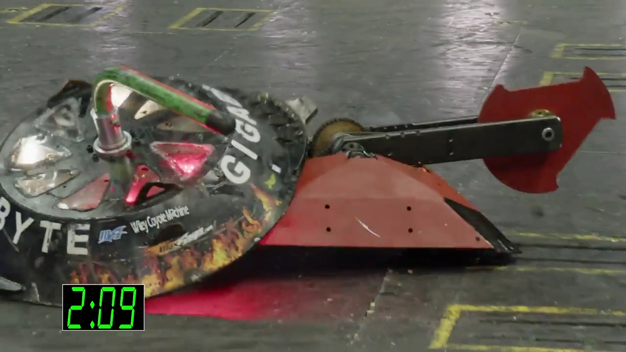 The next match for Gigabyte came against Brutus. As the match got underway, Gigabyte struggled against the wedge of Brutus as each collision deflected it away. After a few repeated hits, Gigabyte eventually lost power to the spinning shell. At this point, its opponent got its weapon going and Gigabyte started to take some hits, though the damage was minor. Gigabyte got a lucky break though as Brutus unwittingly drove up the shell and flipped itself over where it struggled to drive even in circles. Gigabyte backed off and Brutus was counted out, giving Gigabyte the win by KO.