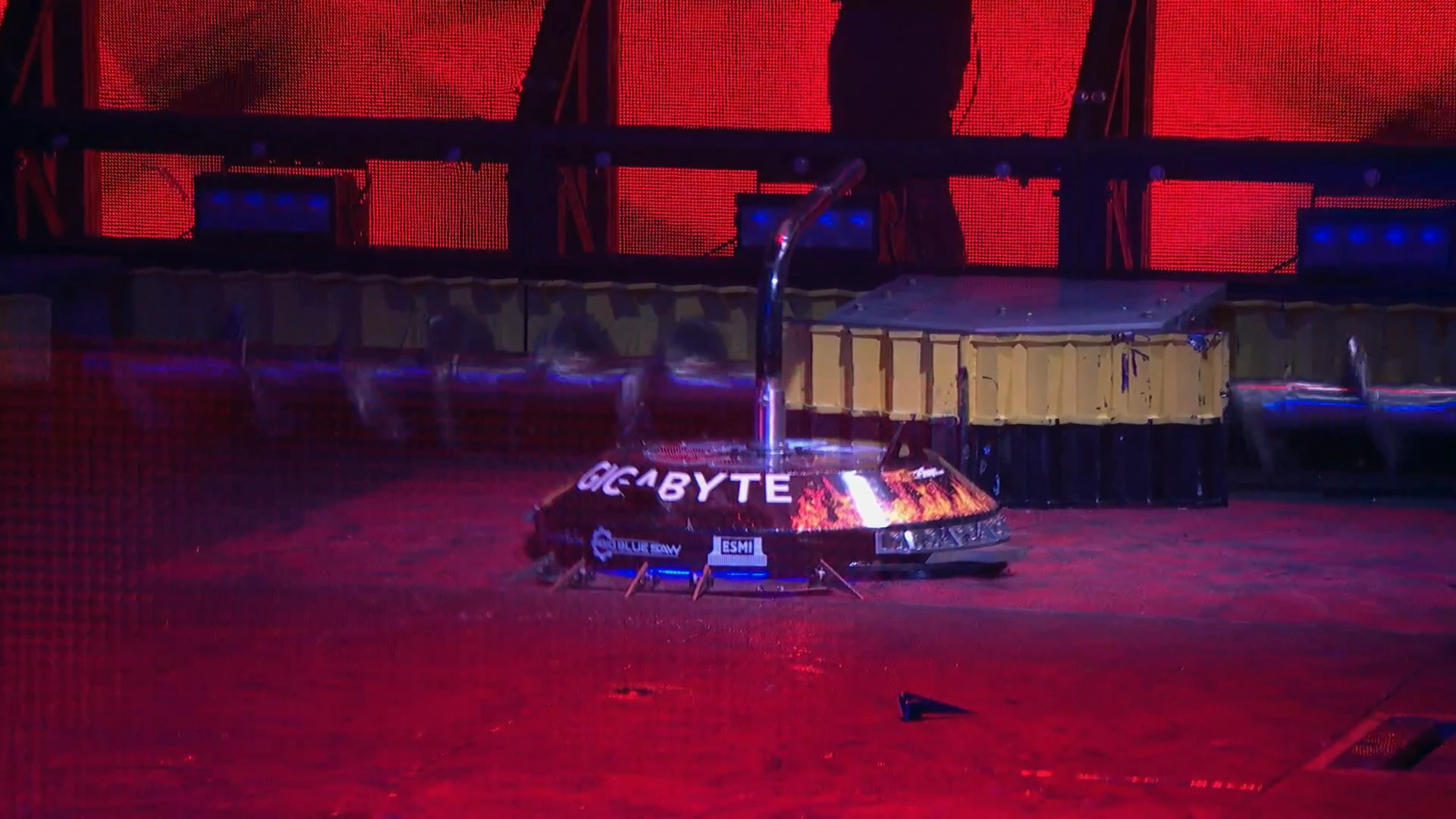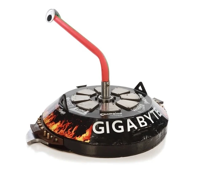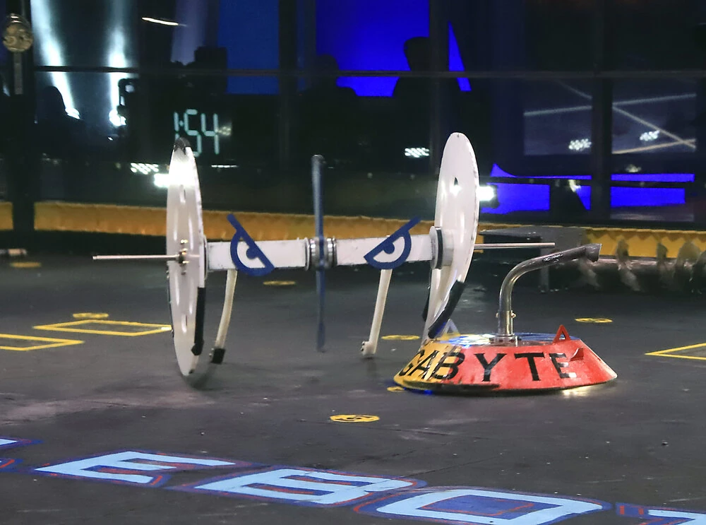 Gigabyte's BattleBots debut was a Main Event clash against defending champion, Tombstone. The Robotic Death Company team opted against fitting Gigabyte's pole, looking to "unsettle" Tombstone and aim for its wheels, as per Brent Rieker's pre-fight interview.