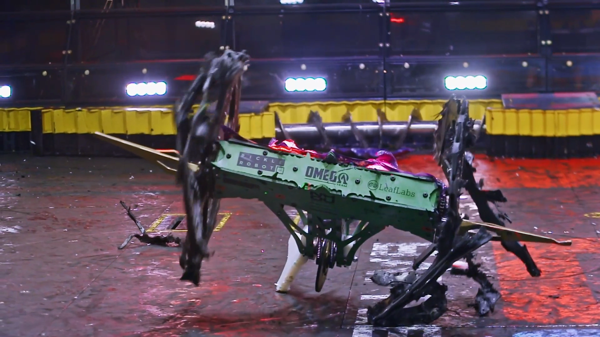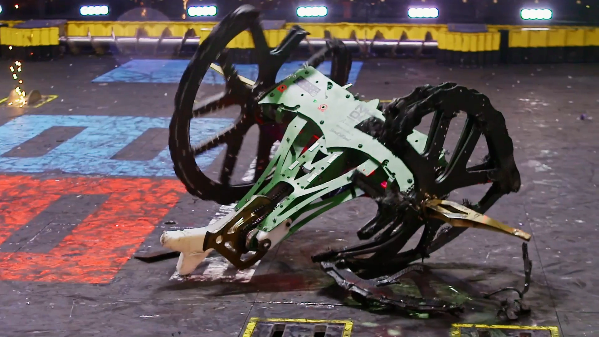 Gigabyte returned to the center of the arena and DOOM looked to back into its opponent. However, it threw itself upside-down after hitting Gigabyte's sloped shell, and its own wraparound armor came loose.