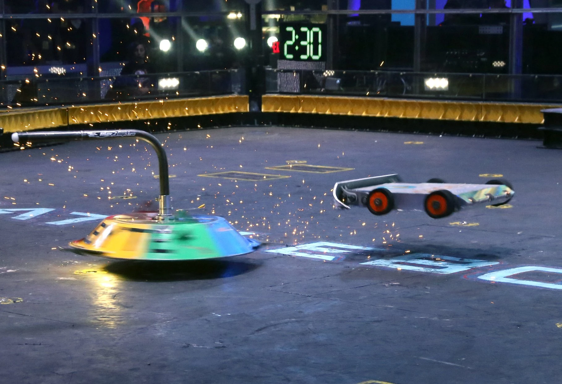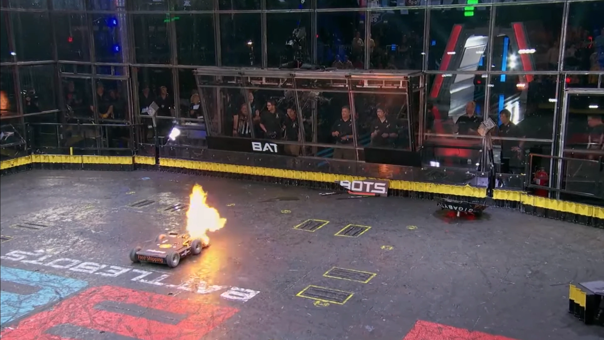Gigabyte was now back up to speed and looking dangerous as it evaded another charge from its opponent. Free Shipping's flamethrower then activated, and as Gigabyte turned sharply, the shell spinner made contact with the left-side wedge of Free Shipping. This sent Gigabyte careening across the BattleBox, first bouncing into the rails near the short corner before ricocheting into the drivers' booths and breaking the BattleBots sign.