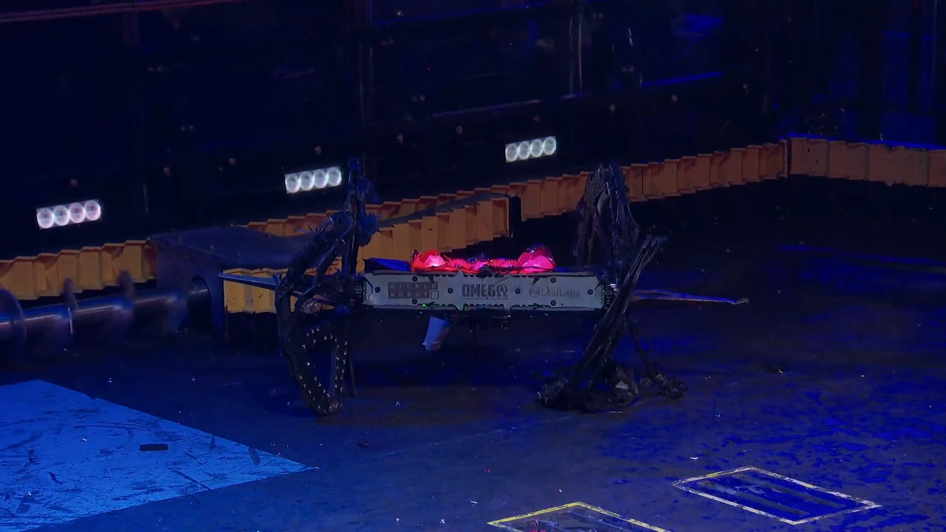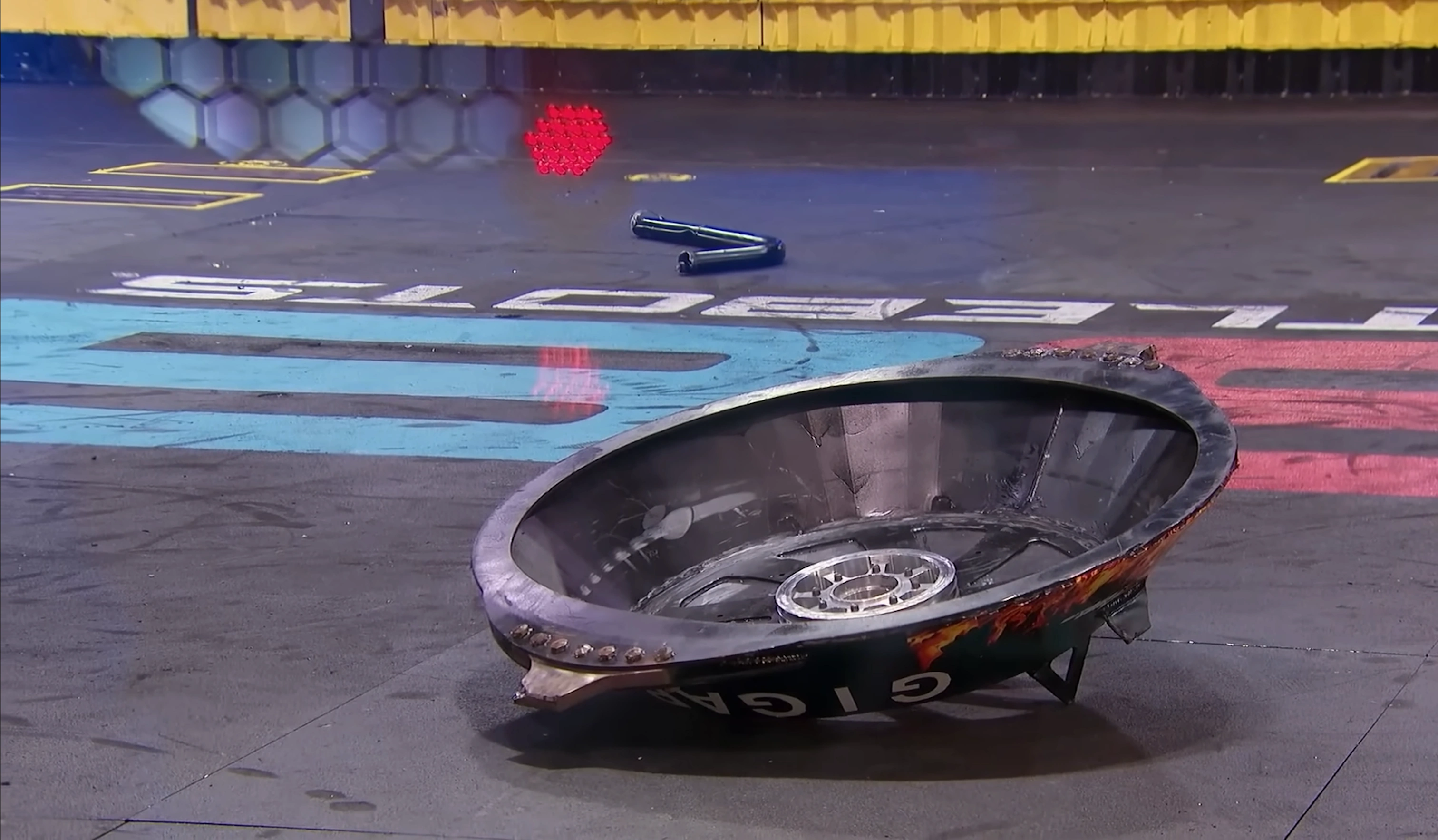 DOOM flailed its arm around in a desperate attempt to self-right, eventually succeeding, but this resulted in their batteries falling out of the robot. Gigabyte returned to its starting square and a count began against the now immobile DOOM, confirming its loss by knockout.