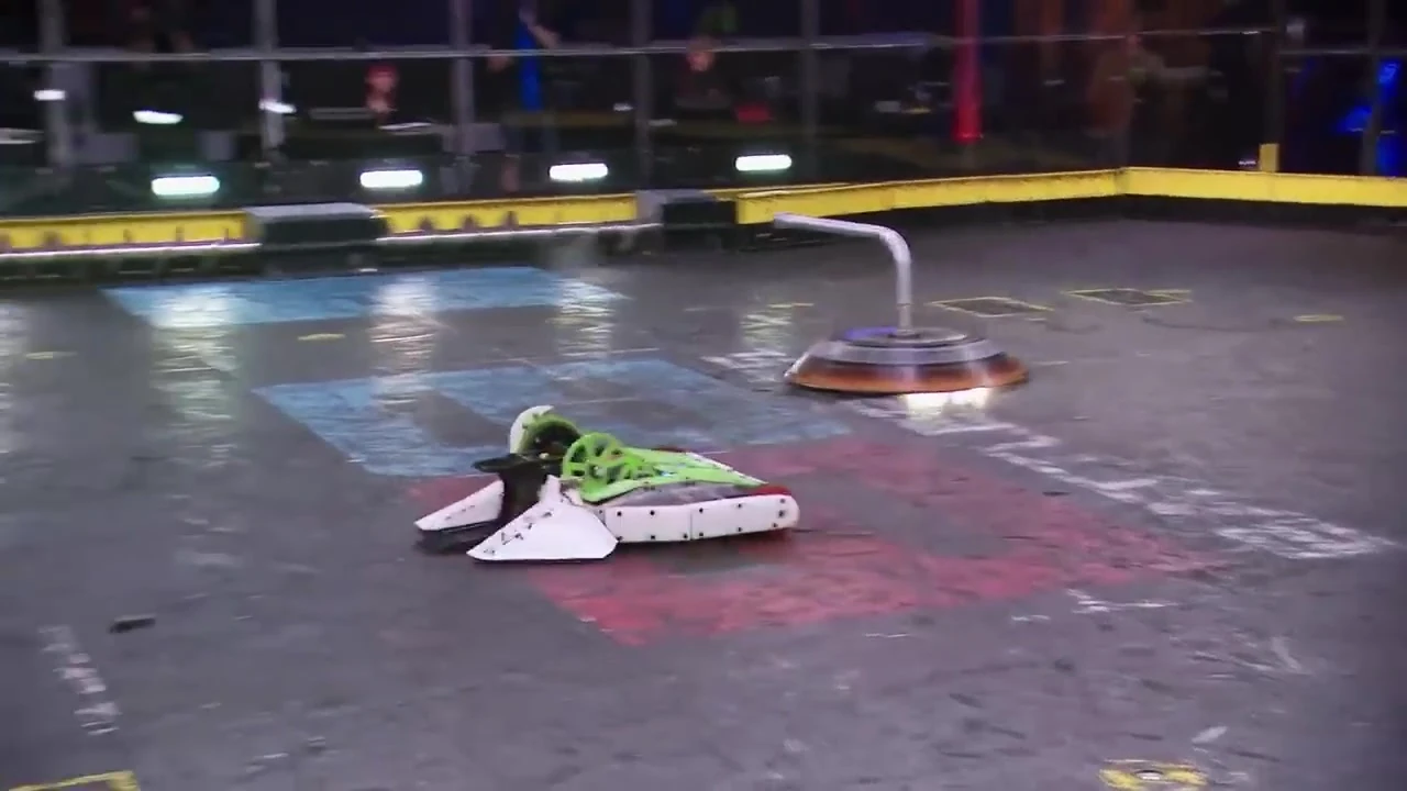 The final impact snapped Gigabyte's pole, and as the robot landed upside-down, it could not use its intended method of righting itself. Gary Gin capitalized by coercing the still-spinning Gigabyte into the corner and nudging it underneath the pulverizer operated by Team Special Delivery.