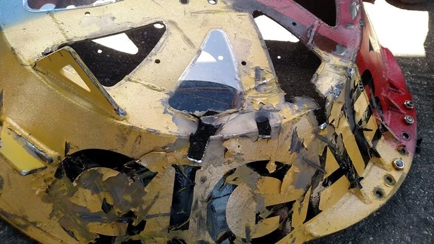 Gigabyte bends one of HUGE's wheels on impact.