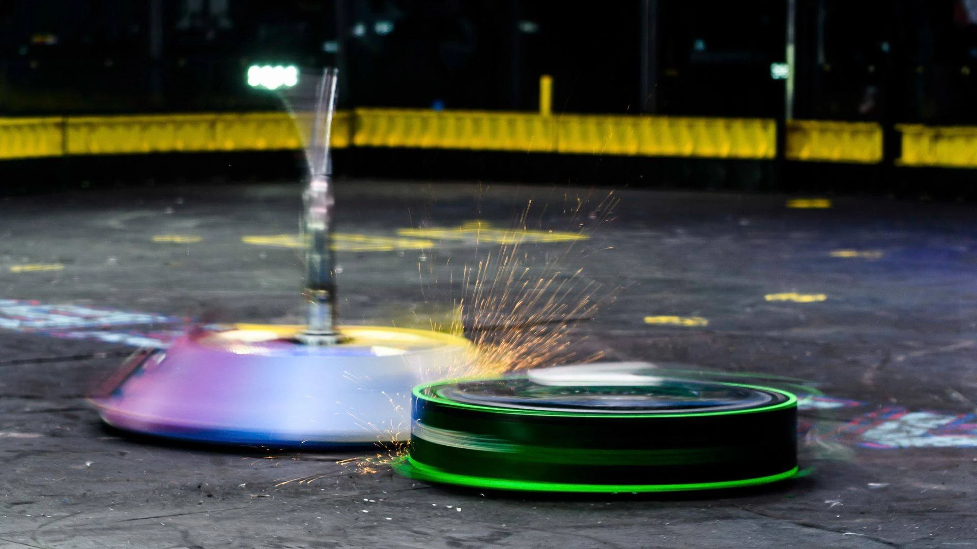 As DeathRoll attempted another charge, Gigabyte drove out of the corner and lured the former towards the Upper Deck screws. Upon making contact with the green machine, it sent DeathRoll into a screw bumper near the blue square, though the same impact would also knock it into a bumper close to the Upper Deck. Gigabyte remained on the corner boundary as it again got its shell up to speed. DeathRoll closed in; a violent collision between both spinners flung Gigabyte against the Lexan.