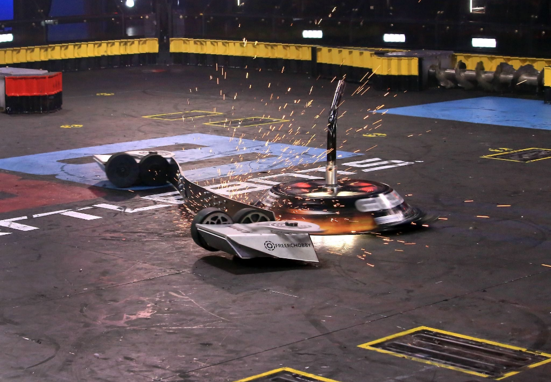 Free Shipping paused as Gigabyte found time and space to get up to speed in the opening seconds of the fight. Gary Gin charged into its opponent, which sent Derek Tran and Camden Wallraff's machine off-balance. Gigabyte quickly used its pole to right itself and escaped the corner, striking the front of Free Shipping in the process.
