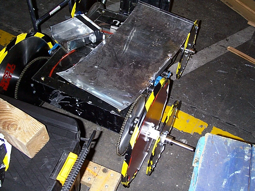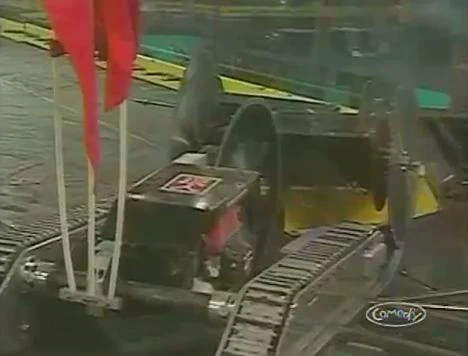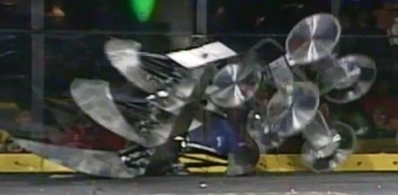 Ginsu vs. Ronin Ginsu being attacked by Ronin. Now in the final eight, Ginsu took on Peter Abrahamson and Ronin. Ginsu drove over the hellraisers early on, as Ronin slowly moved out of its starting square. Both robots collided and Ginsu nearly drove over the top of its opponent. Ginsu recalibrated and immediately charged into the side of Ronin again. Ginsu backed up and threw itself into the front of Ronin, but Ginsu got its front right saw stuck on top of Ronin's own saw weapon. Both robots were separated and Ginsu's drive train fell apart. Both robots were moving around the arena but Ginsu was caught on the killsaws, which ripped one of the front saw wheels from Ginsu. Ronin started attacking Ginsu with its saw blade and pushed it against the spikestrip. Ginsu was now showing limited mobility and Ronin took it to the entrance ramp. Ginsu got itself stuck between the entrance ramp and the spikestrip and played little part in the remainder of the fight as Ronin kept on attacking Ginsu. Time ran out and Ronin won on a 7-2 judges' decision and Ginsu was eliminated from the tournament. |