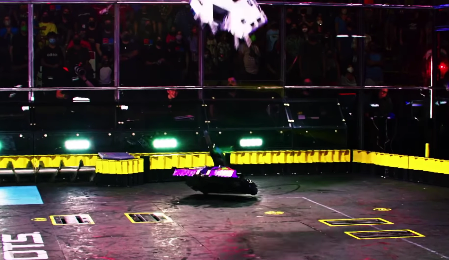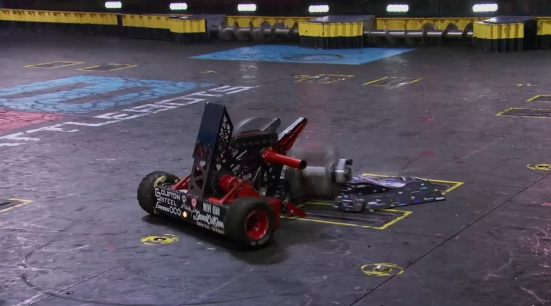 As it flew through the air, its lithium polymer batteries came loose and the horizontal spinner cut through them, thus causing ROTATOR to smoke heavily upon landing.