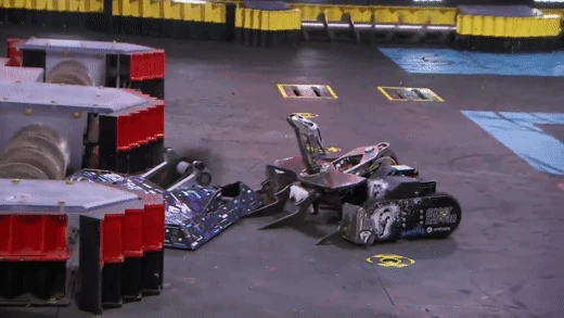 With no active weapon, Triton tentatively pushed Glitch towards the wall, hoping to ram Glitch weapon-first into the rails and use its own power against itself. With its back facing Triton, Bradley Hanstad's bot drove up the back of Glitch, throwing itself into the air, but more importantly, overturning its opponent.