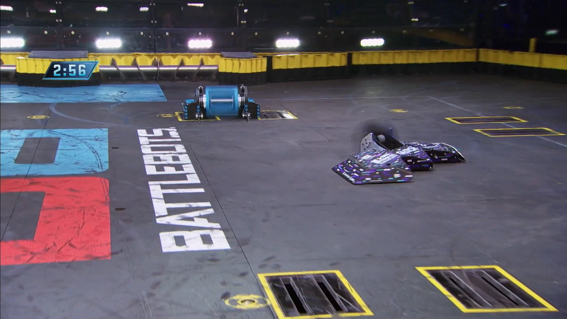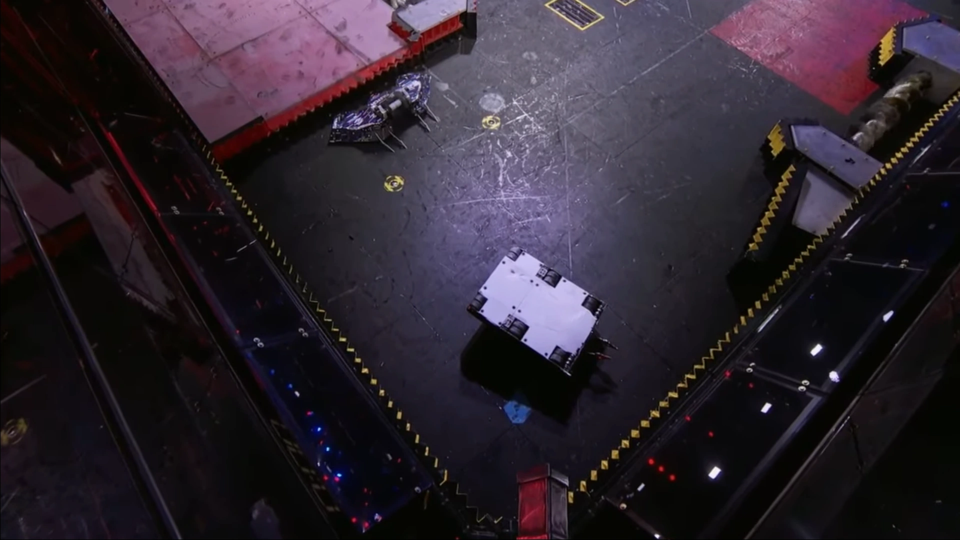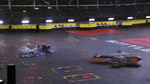 Both robots got their weapons up to speed and as Riptide darted towards its starting square, Glitch strafed to avoid it. However, Riptide's eggbeater spinner caught the widest point of Glitch's chassis, which sent it careening across the BattleBox, slamming into the Upper Deck. Glitch landed upside-down and motionless.