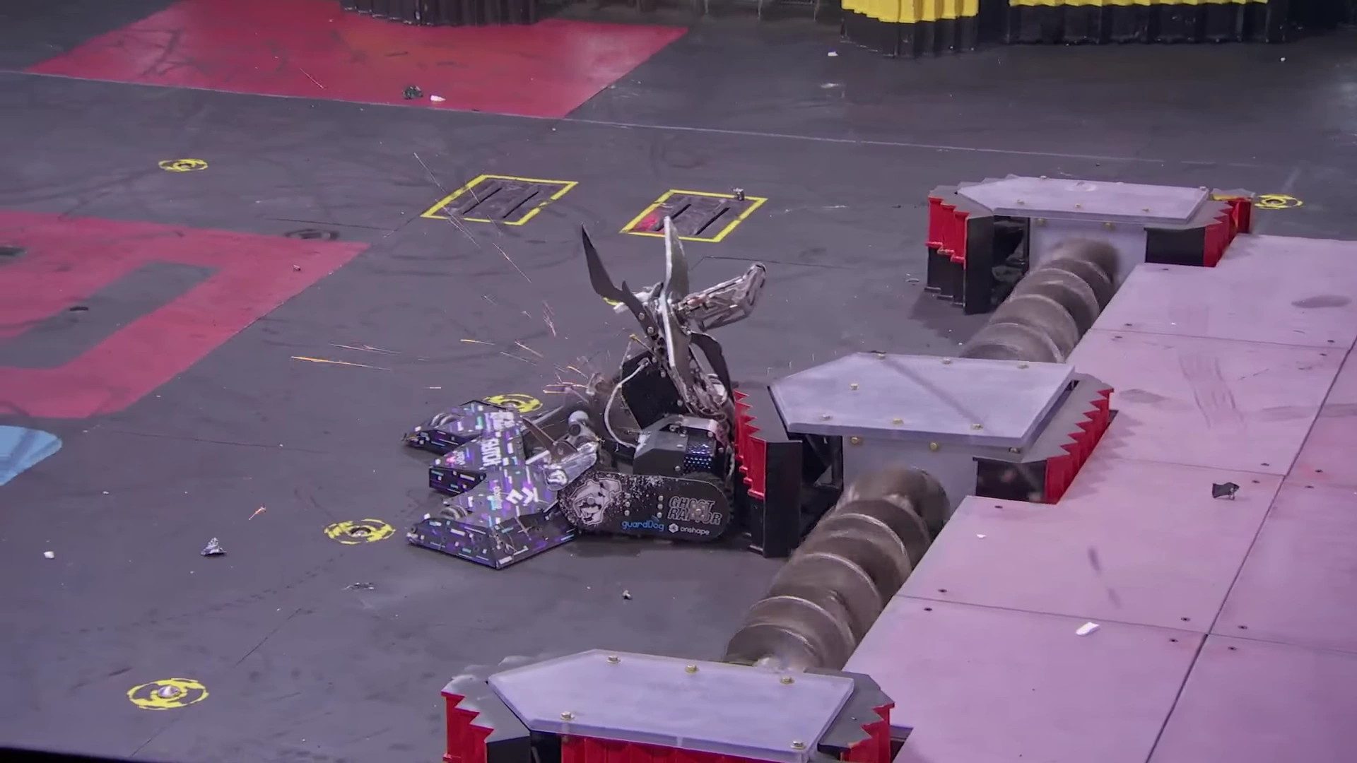 Wanting to keep the fight going, Chuck Pitzer opted to continue the fight by freeing the rookie team. Ghost Raptor then drove Glitch into the opposite arena barrier but this time, they were able to drive away. Glitch strafed to keep its weapon pointed at Ghost Raptor as both bots evaded one another for some time. Glitch then landed another hit with its eggbeater spinner which tossed Ghost Raptor over. It self-righted, but Glitch showed a surge of power as it rammed Ghost Raptor into the Upper Deck and upended it once more, then began to grind at the underneath of its lifting weaponry.