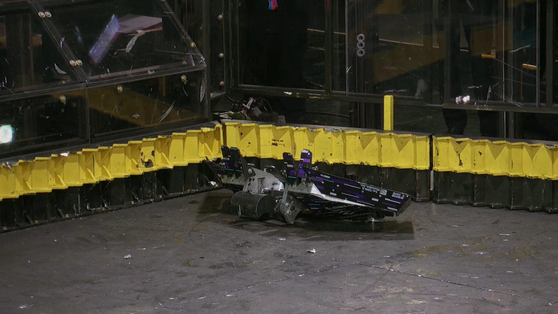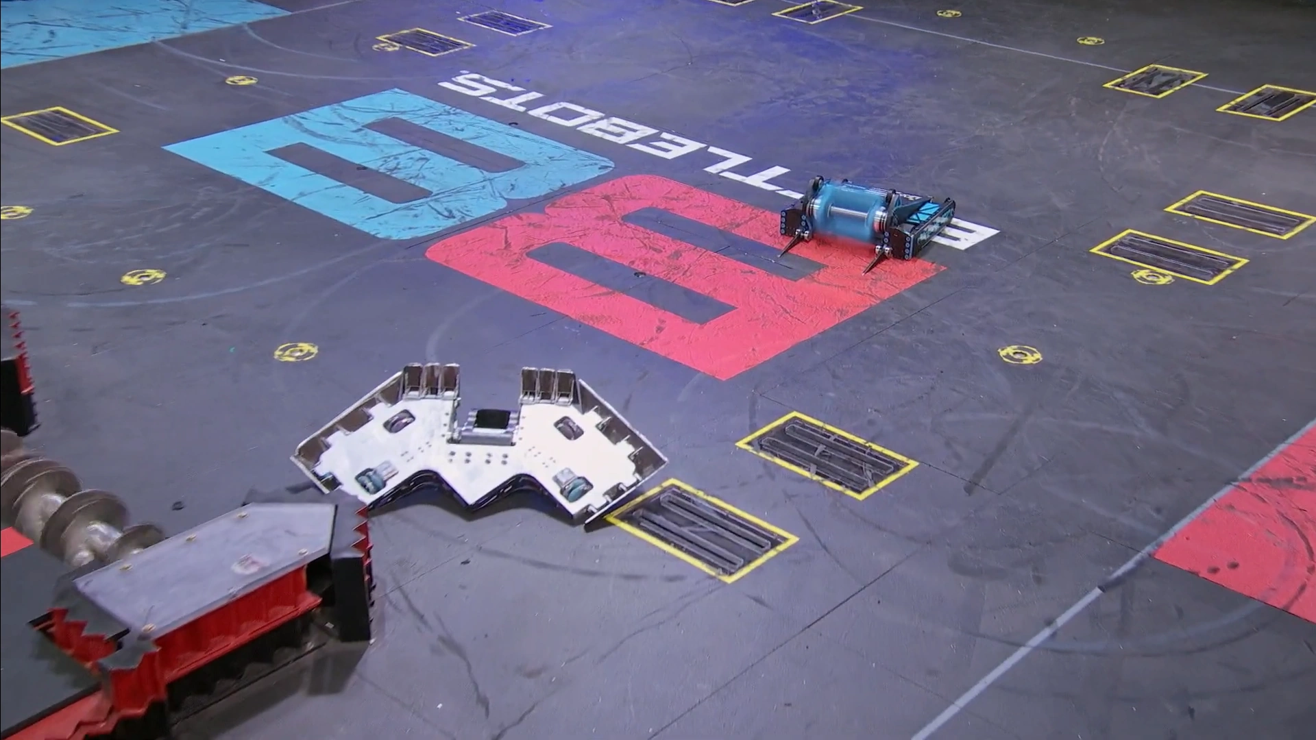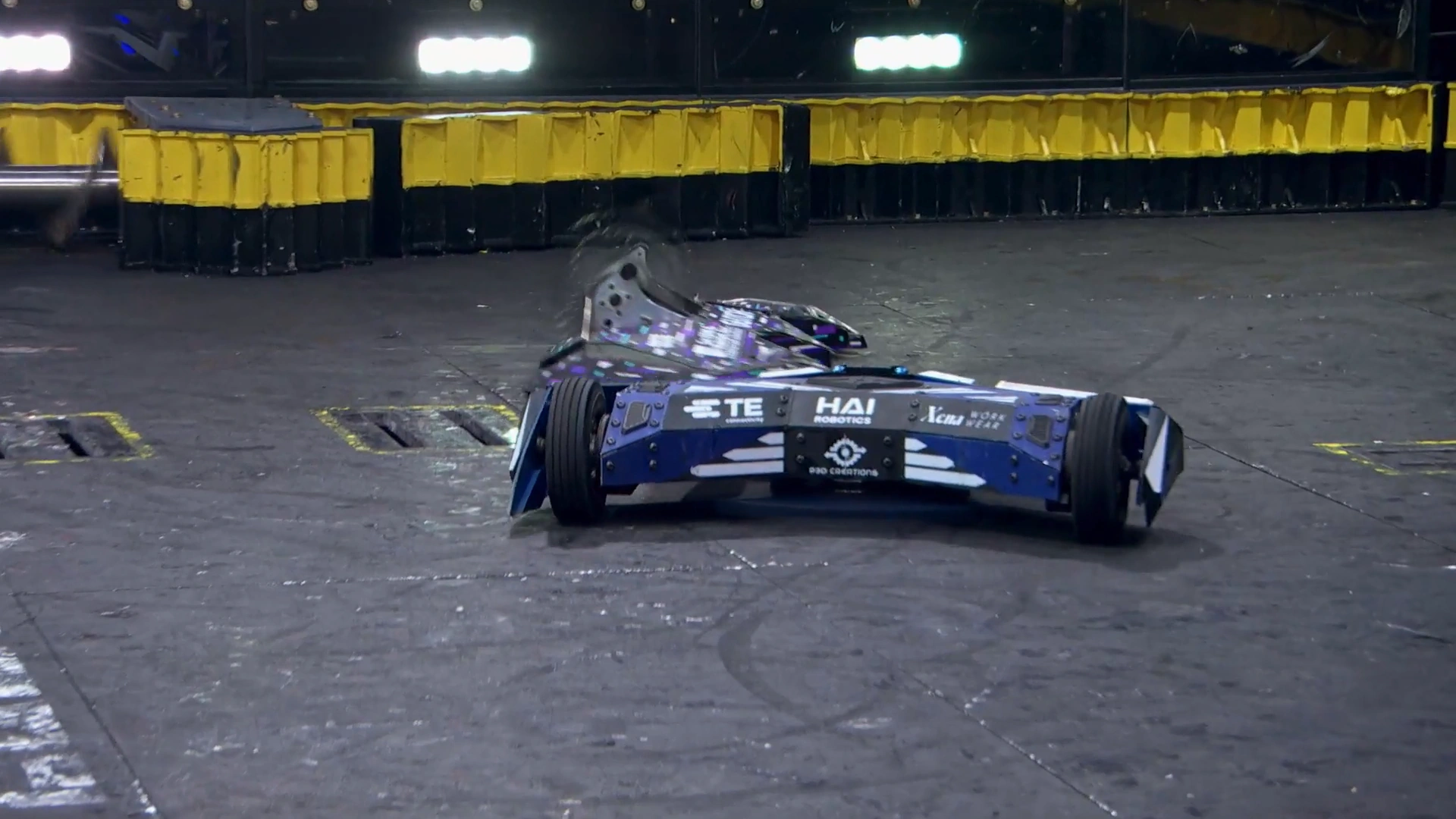 Not wanting to hit an incapacitated opponent, Valkyrie intentionally held back as the referees initiated multiple count-outs on Glitch. This, however, was cut from the final edit.[15] Glitch was able to get itself away from the killsaws and now faced the other way, but its wheels were spinning on the right side, unable to make contact with the floor. One of its armor panels had also been peeled away at this stage. Valkyrie took a controlled approach as it grazed its undercutter against its opponent, something Kenny Florian lamented in commentary.